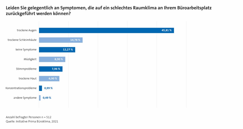 Befragt nach der allgemeinen Einschätzung des Raumklimas zeigten sich die Teilnehmenden mit einer durchschnittlichen Schulnote von 3,1 nur mäßig zufrieden. Konkret zu den Beschwerden befragt äußerten die Büroangestellten am häufigsten Symptome, die aus zu trockener Raumluft resultieren: 46 % klagen über trockene Augen, 15 % über trockene Schleimhäute und zehn Prozent über trockene Haut. Neun Prozent bringen Müdigkeit und acht Prozent Stimmprobleme in Zusammenhang mit dem Raumklima. Über diese subjektiv wahrgenommenen Befindlichkeitsstörungen hinaus wird das Risiko von Atemwegsinfektionen – insbesondere Covid-19 – direkt mit dem Raumklima in Verbindung gebracht: 44 % bewerten die Gefahr einer Ansteckung mit dem Corona-Virus im Büro als „hoch“ oder „sehr hoch“. Nur 25 % betrachten die Gefahr als gering.