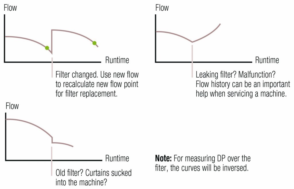 Die präziseste Filterüberwachung wird erreicht, wenn sowohl der Differenzdruck als auch der Fluss gemessen wird und damit Druckveränderungen relativ zum Luftfluss bestimmt werden können. Später wird gezeigt, dass es in gewissen komplexen Anwendungen unabdingbar ist, beide Parameter zu messen.