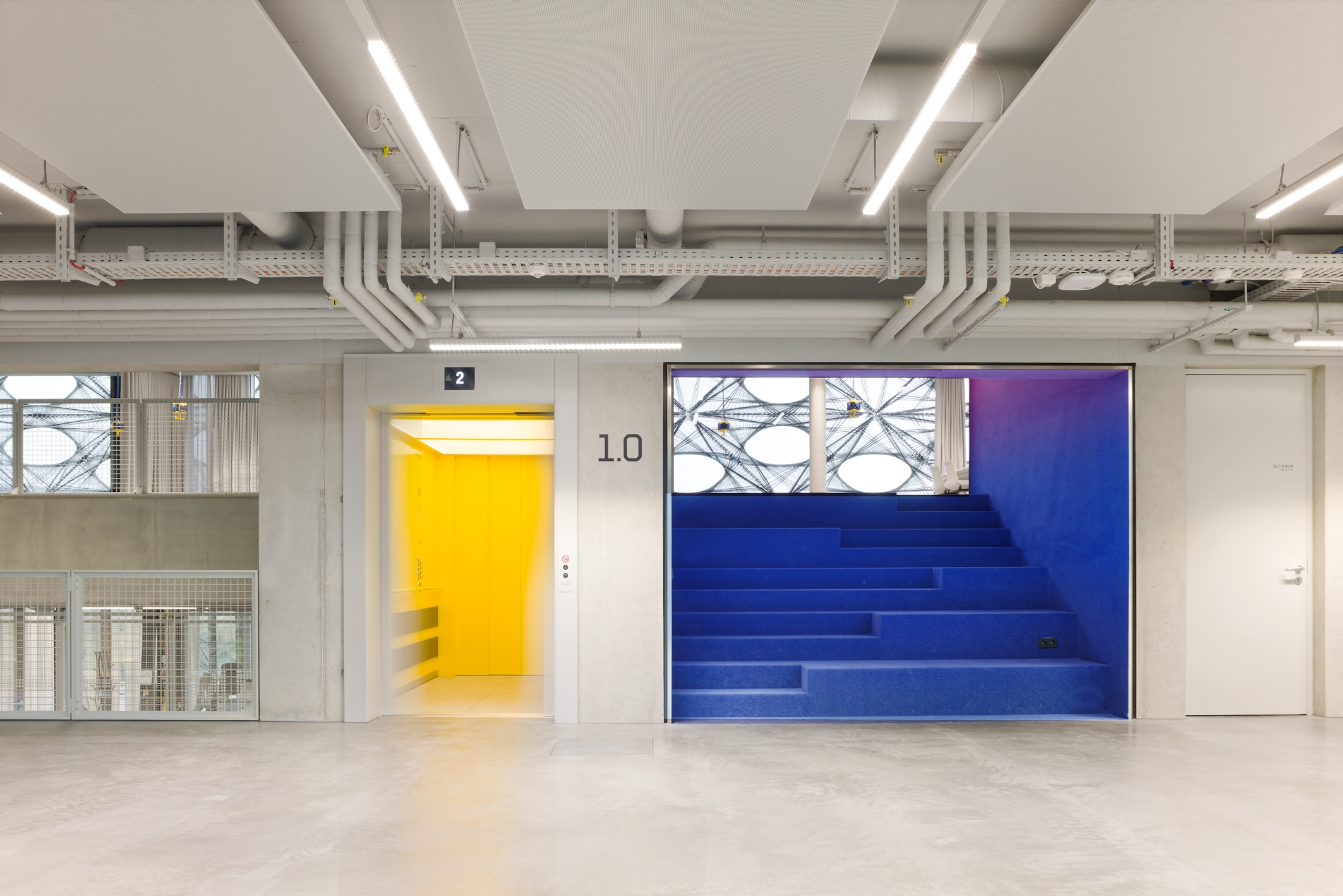 Das offene Raumkonzept mit Atrium und den halbgeschossig gestaffelten Raumebenen erhielt einen industriellen Charakter mit Betonelementen und technischen Decken samt freiliegenden Leitungen. Zu den puristischen Details der Innengestaltung gehört auch die optisch einheitliche Beleuchtungslösung mit schlanken, tiefbreitstrahlenden Lichtlinien. Zusammen mit den Akustiksegeln sind sie als unverwechselbare Design-Elemente verbaut.