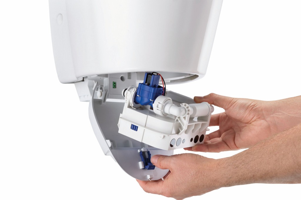 Dank der praktischen Dockingstation ist die Steuereinheit leicht zugänglich und lässt sich mit nur einem Handgriff entnehmen. Installation, Wartung und Umrüstung gehen damit besonders schnell von der Hand. Die Wasserzufuhr muss dank einer automatischen Wasserstopp-Funktion nicht abgesperrt werden, so dass Reihenanlagen während der Wartung eines oder mehrerer Urinale weiter betrieben werden können. Entscheidender Vorteil: Die Urinalkeramiken müssen dafür nicht extra abgenommen werden. Der Siphon ist von oben gut entnehmbar und ermöglicht einen direkten Zugang zum Entwässerungssystem. Auch der Sprühkopf lässt sich für Reinigung oder Austausch einfach abnehmen.