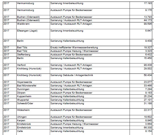 Bei der Förderung stehen Maßnahmen zum Erreichen einer möglichst klimaneutralen Wärmeversorgung beziehungsweise der Steigerung des Anteils erneuerbarer Energien als auch zur Reduzierung des Einsatzes von Ressourcen (Wasser, Chemikalien zur Desinfektion des Beckenwassers) im Vordergrund; insbesondere Maßnahmen, mit denen erstmalig ein Anteil erneuerbarer Energien und/oder unvermeidbarer Abwärme an der Wärmeversorgung von mindestens 75 % erreicht wird.