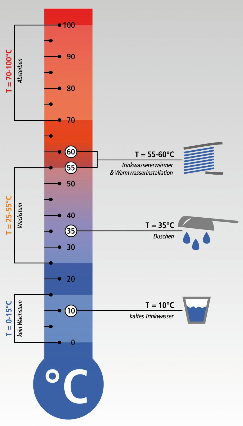 Niedrige Temperaturen bieten den Erregern schlechte oder keine Wachstumsbedingungen. Temperaturen nahe dem Wachstumsoptimum ermöglichen ein schnelles Wachstum. Bei Legionellen, atypischen Mykobakterien, aber auch bei P. aeruginosa sind Temperaturbereiche zwischen > 25 °C und < 55 °C, insbesondere aber 30 – 42 °C strikt zu vermeiden.