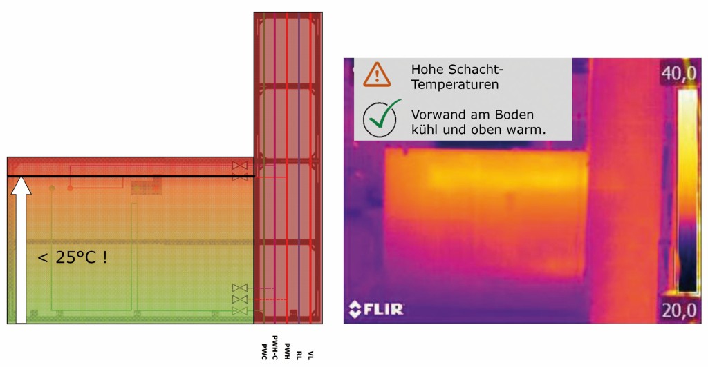 Diese Installationsweise erhöht die trinkwasserhygienische Qualität einer Warmwasserinstallation erheblich, vergrößert aber auch die wärmeabgebende Oberfläche. Das hat zur Folge, dass zusätzlich Wärme in den Installationsraum (Schacht/Vorwand) eingetragen wird. Werden die zirkulierenden Warmwasserleitungen im unteren Bereich des Hohlraums einer Installations-Vorwand verlegt, erwärmt das kontinuierlich fließende Warmwasser die umgebende Luft. Auch hier kann eine thermische Trennung Abhilfe schaffen. Durch Verlegung der Warmwasserleitungen in der oberen Zone der Vorwand, wird der untere Bereich nicht mehr von der konvektiven Luftströmung erfasst [11]. Er bleibt weitestgehend kalt und empfiehlt sich so als Installationsraum für die Kaltwasserleitungen.