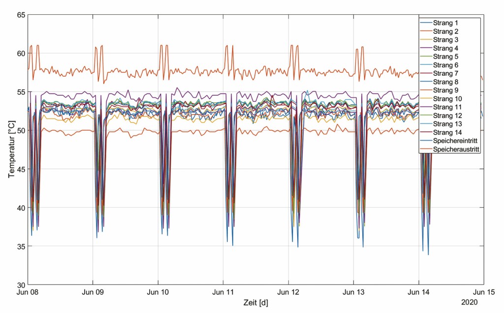 Aus hygienischen Gründen ist vielmehr besonders die Anzahl der Temperaturwerte, die länger als fünf Minuten unter 55 °C lagen, als kritisch zu bewerten. Die Systeme reagieren augenscheinlich zu schnell auf sich verändernde Betriebsbedingungen. In der Folge kommt es zu einem Aufschwingen in der Zirkulation und dadurch zu einer Unterversorgung einzelner Stränge, weil die Regulierventile in pumpennäheren Strängen bei Abfall der Temperatur sofort weiter öffnen und somit weniger Volumenstrom für die pumpenferneren Stränge zur Verfügung steht. Diesem Öffnen folgen nur wenig später aber gleichfalls die Ventile in den pumpenferneren Strängen, da ja aufgrund des höheren Bedarfs der ersten Stränge jetzt dort ein Temperaturabfall entsteht – es kommt in den hinteren Strängen zwangsläufig zu einem Überschwingen der Temperatur.
