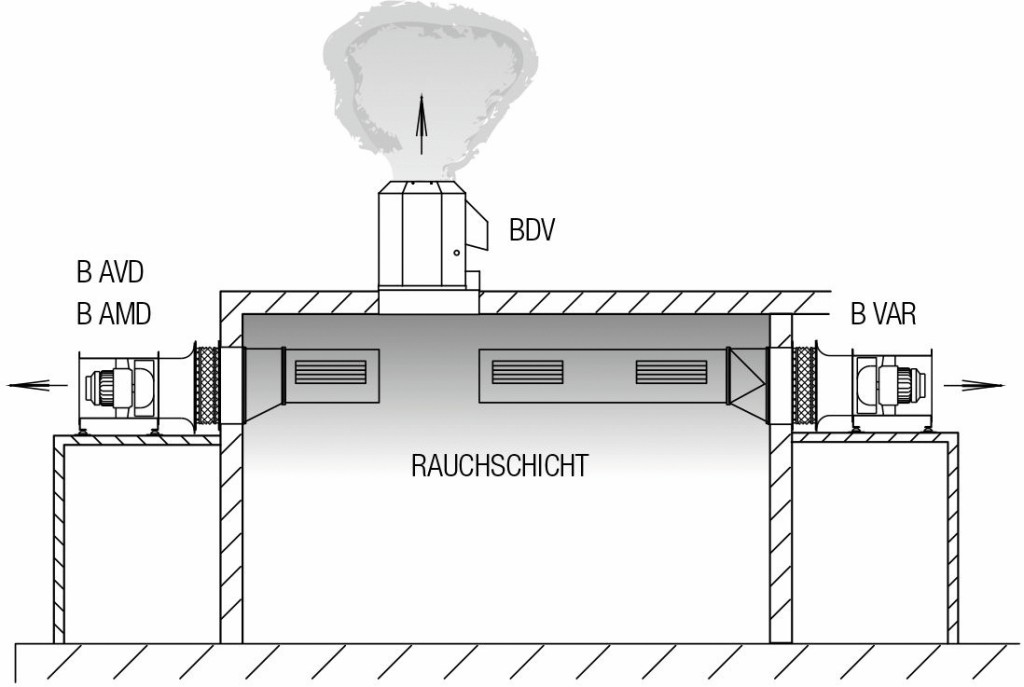 Ist durch die baulichen Gegebenheiten der Einsatz einer natürlichen Rauchabzugsanlage (NRA) nicht möglich (z. B. mehrgeschossige Gebäude oder innenliegende Bereiche), so kommt eine maschinelle Rauchabzugsanlage (MRA) mit Entrauchungsventilatoren zum Einsatz. Diese werden aber nicht nur aus baulichen Gründen an Stelle einer natürlichen Entrauchungsanlage vorgesehen – häufig spricht auch ein Investitionskostenvergleich für ein maschinelles Entrauchungssystem. Bei einer MRA erfolgt der Abtransport der Rauchgase mittels geeigneter Entrauchungsventilatoren nach DIN EN 12101–3. In Abhängigkeit der verbrennenden Materialien bildet sich im Brandfall in kürzester Zeit toxischer Rauch. Aufgrund des thermischen Auftriebs staut sich das Rauchgas unterhalb der Decke und bildet ein Polster, das sich im weiteren Verlauf des Rauchs horizontal unter der Decke ausbreitet. Eine maschinelle Entrauchung verfolgt das Schutzziel, im unteren Bereich eine raucharme Schicht zu schaffen. Diese ermöglicht die Selbstrettung der sich im Gebäude befindenden Personen sowie die Durchführung von Rettungs- und Brandbekämpfungsmaßnahmen durch die Feuerwehr. Über ausreichend dimensionierte Nachströmöffnungen (Nachströmgeschwindigkeit ≤ 1 m/s) wird aufgrund der Absaugung der heißen Rauchgase und des durch den Brand entstehenden Unterdrucks, im unteren Gebäudebereich ausreichend Frischluft eingebracht.