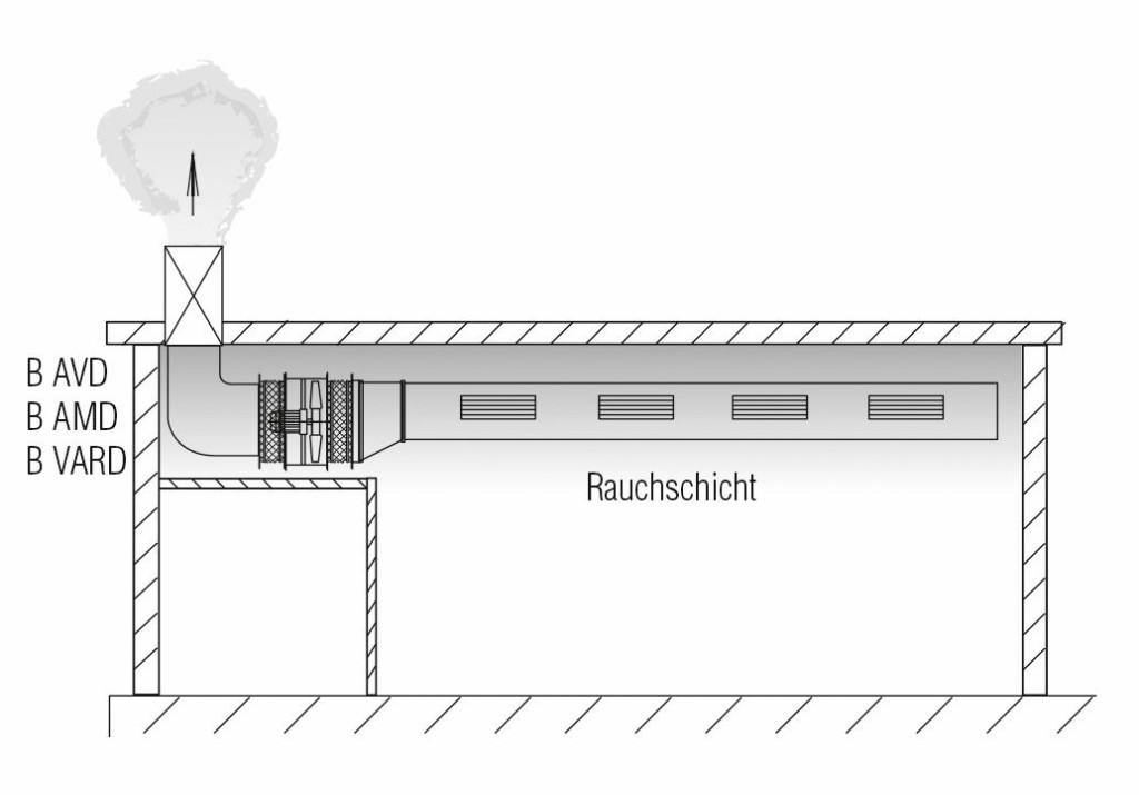 - Aufstellung des Entrauchungsventilators innerhalb des Rauchabschnitts.
