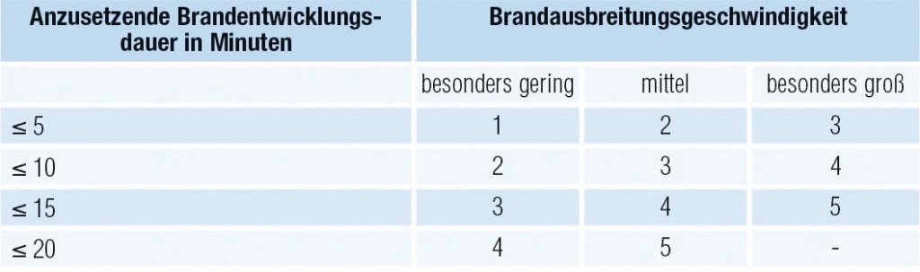 Die anzusetzende Brandentwicklungsdauer ist abhängig von dem zeitlichen Eintreffen der Feuerwehr. Sie beschreibt die Zeit von der Brandentstehung bis zum Beginn der Brandbekämpfung. Üblicherweise ist eine Zeit von 10 min anzusetzen. Bei sehr günstigen Randbedingungen (Werkfeuerwehr) kann die Zeit auf 5 min reduziert werden. Bei ungünstigen oder gar außergewöhnlichen Umständen ist der Wert auf 15 bzw. 20 min zu erhöhen. Die Brandausbreitungsgeschwindigkeit ist abhängig von der Brennbarkeit der Brandlast. Im Normalfall ist hier der mittlere Wert anzusetzen. Geringe Brandausbreitungsgeschwindigkeiten können bei brennbaren Stoffen in nicht brennbarer Verpackung angenommen werden. Große Brandausbreitungsgeschwindigkeiten sind anzusetzen, wenn Stoffe mit hoher Flammausbreitungsgeschwindigkeit vorhanden sind. Die ermittelte Bemessungsgruppe darf im Falle einer Sprinkleranlage um eine Stufe reduziert werden. Beträgt die Lagerguthöhe > 1,50 m ist die ermittelte Bemessungsgruppe um eine Stufe zu erhöhen. Wurde Gruppe 5 bereits erreicht, so darf die Lagerguthöhe 1,50 m nicht überschreiten.
