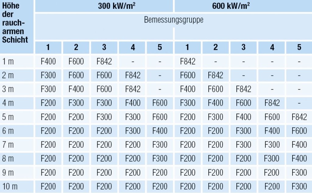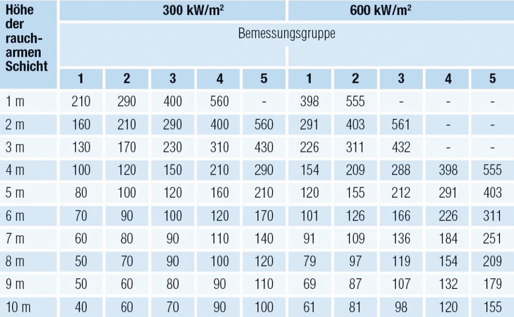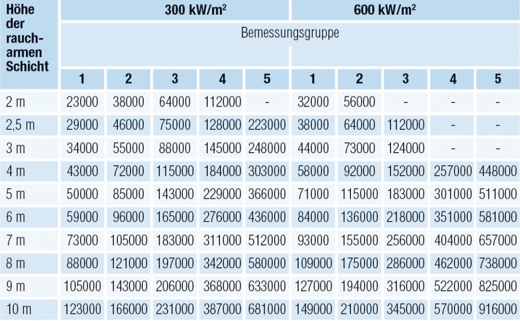 Der für den Rauchabschnitt (Stan-dard ≤ 1 600 m², erweiterbar auf max. 2 600 m²) abzuführende Rauchgas-Volumenstrom ist nach Tabellen zu ermitteln. In Abhängigkeit der Höhe der raucharmen Schicht, Wärmefreisetzungsrate und Bemessungsgruppe ist der Entrauchungsvolumenstrom darin vorgegeben.