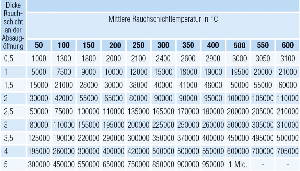 Hier kann, unter Berücksichtigung der Dicke der Rauchschicht an der Absaugstelle und der mittleren Rauchschichttemperatur der maximal zulässige Rauchgasvolumenstrom abgelesen werden.