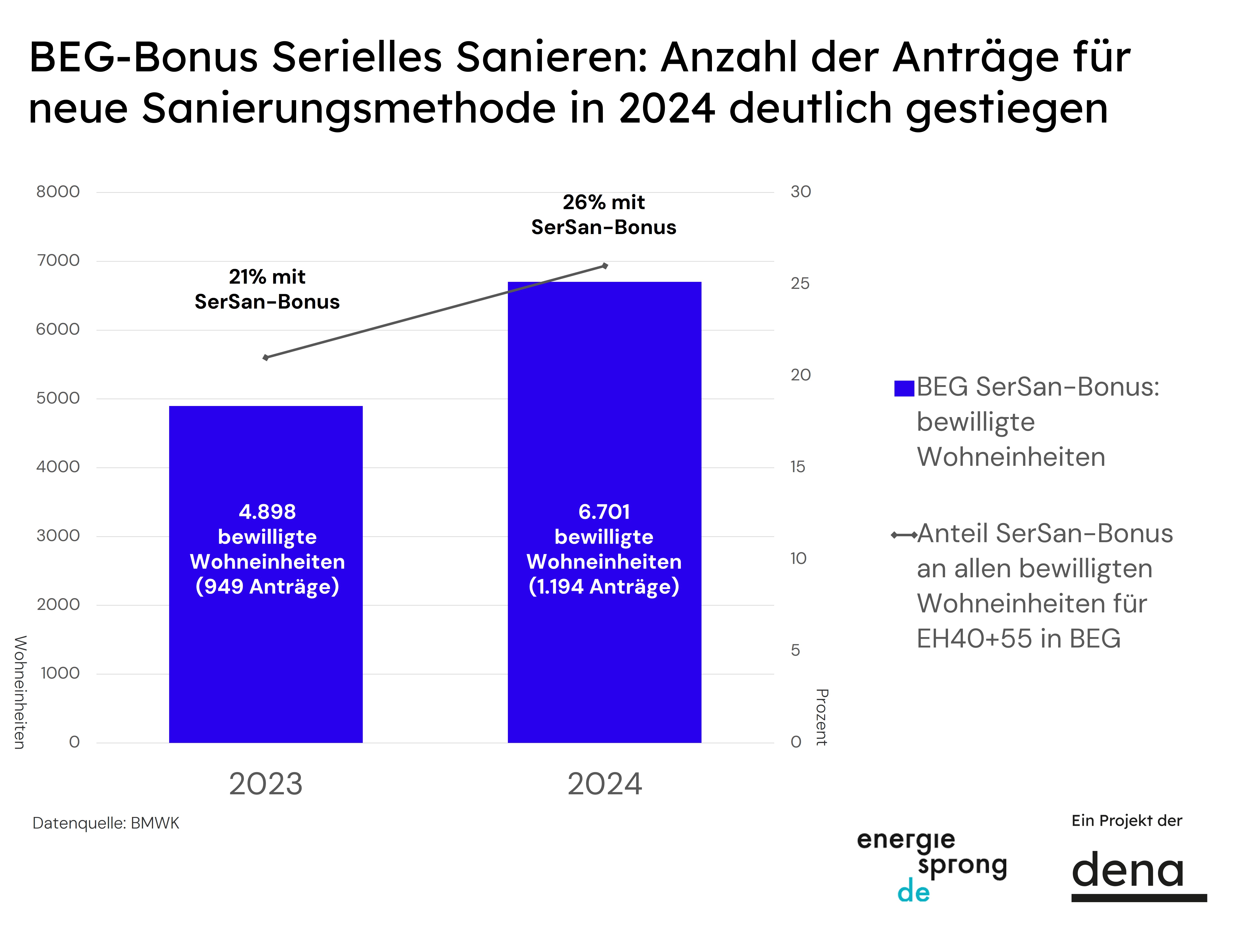 Die dena taxiert das bisher für Ein- und Mehrfamilienhäuser sowie Nichtwohngebäude ausgelöste Marktvolumen im seriellen Sanierungsmarkt auf insgesamt etwa zwei Milliarden Euro. Einen Großteil erwirtschaften hierbei mittelständische Unternehmen. Das Gesamtpotenzial für den noch zu entwickelnden Breitenmarkt schätzt die dena bis 2045 auf rund 500 Milliarden Euro für Ein- und Mehrfamilienhäuser sowie Nichtwohngebäude, die sich für serielles Sanieren eignen. Der Hauptfokus liege hierbei auf Gebäuden aus den 1950er- bis 1970er-Jahren. Die rund 500 Milliarden Euro Sanierungsvolumen würden zu einem großen Teil durch eingesparte Energiekosten refinanziert, so die Prognosen.