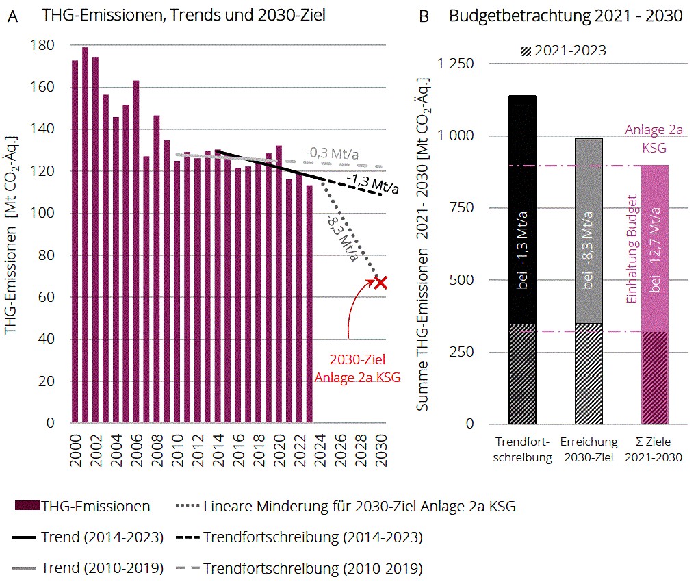 Vergleicht man die Trends der Schadstoffbelastung der Jahre 2010 bis 2019 und der Jahre 2014 bis 2023 mit dem 2030-Ziel, zeigt sich für den Gebäudesektor eine Beschleunigung der Reduktion. In den Jahren 2010 bis 2019 lag der Trend bei –0,3 Millionen Tonnen pro Jahr, in den Jahren 2014 bis 2023 bei –1,3 Millionen Tonnen. Beide Trendfortschreibungen würden zu höheren THG-Emissionen führen als die festgelegte Jahresemissionsmenge für das Jahr 2030.