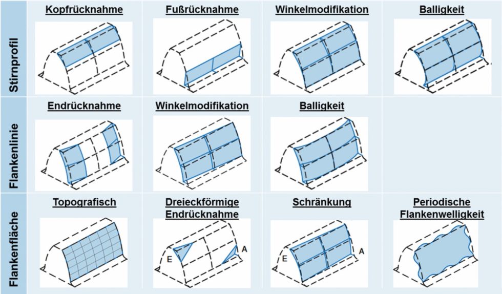 Die gewünschte Mikrogeometrie einer Verzahnung wird zumeist durch die Überlagerung mehrerer Standardkorrekturen erzielt. In DIN ISO 21771 [3] sind die Standardkorrekturarten definiert. Sie beschreiben den Flankenbereich, in dem die Korrekturen wirksam sind. Bild 1 zeigt eine Übersicht der Standardkorrekturarten.