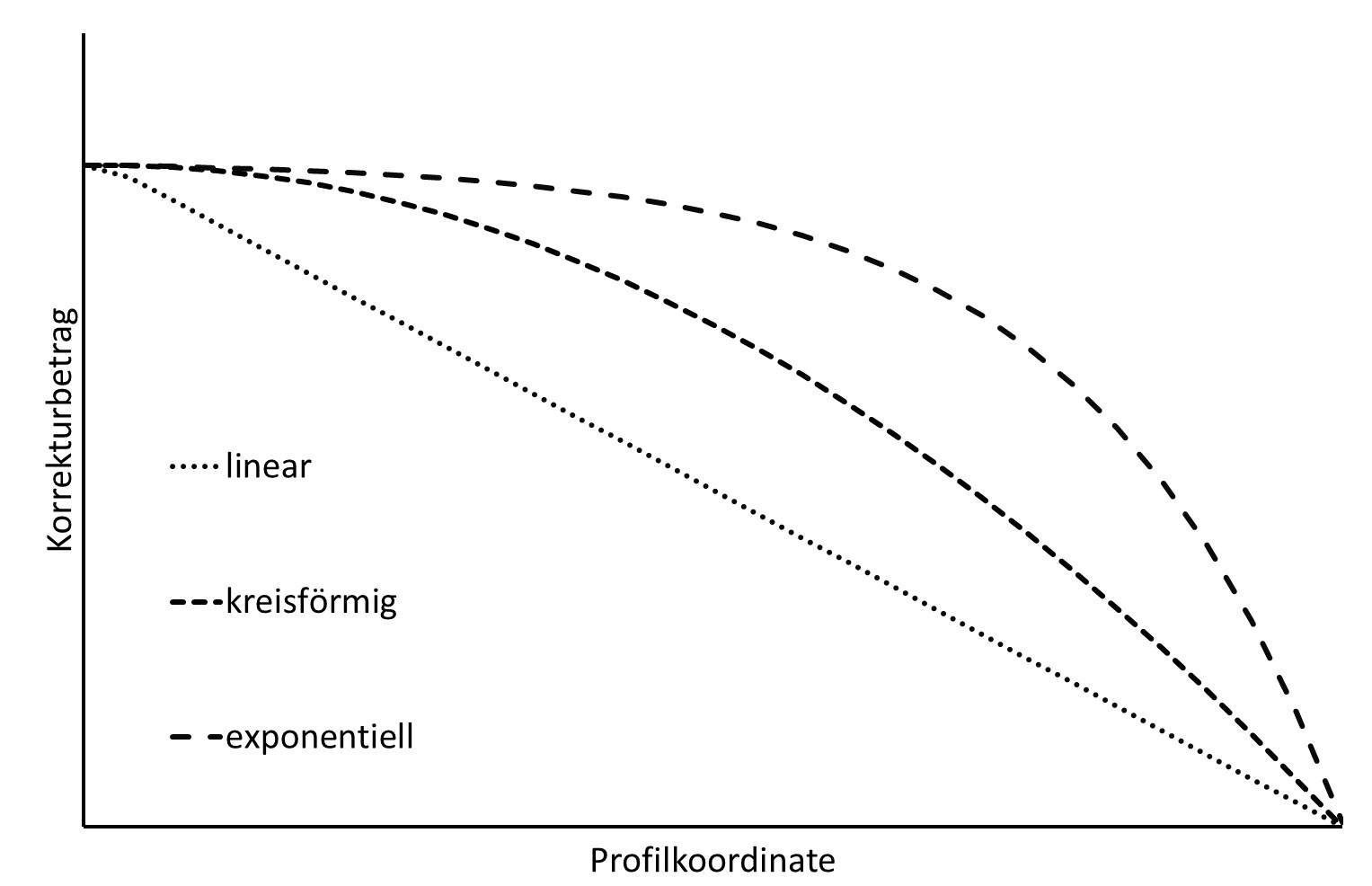 Des Weiteren ist die Form der Korrektur relevant. Sie beschreibt den Verlauf und ist z. B. in [2] beschrieben. Bild 2 zeigt die Formen linear, kreisförmig und exponentiell im Vergleich bei gleicher Korrekturlänge und gleichem Korrekturbetrag.