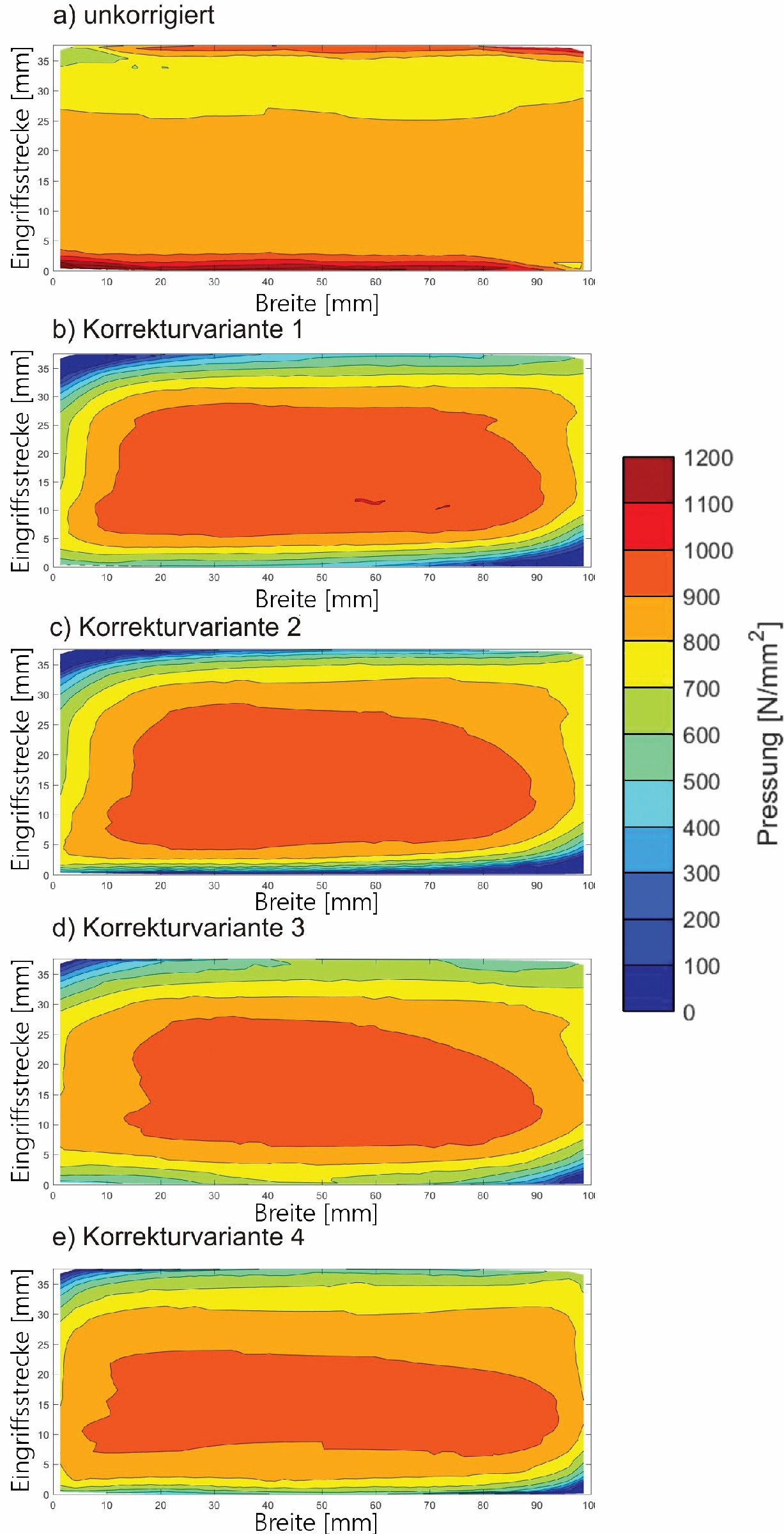 Bild 5e zeigt die Pressungsverteilung. Es zeigt sich erneut der Vorteil des exponentiellen Korrekturverlaufs. Es konnte im Vergleich zum linearen Verlauf (Variante 3) eine gleichmäßigere Pressungsverteilung erreicht werden.