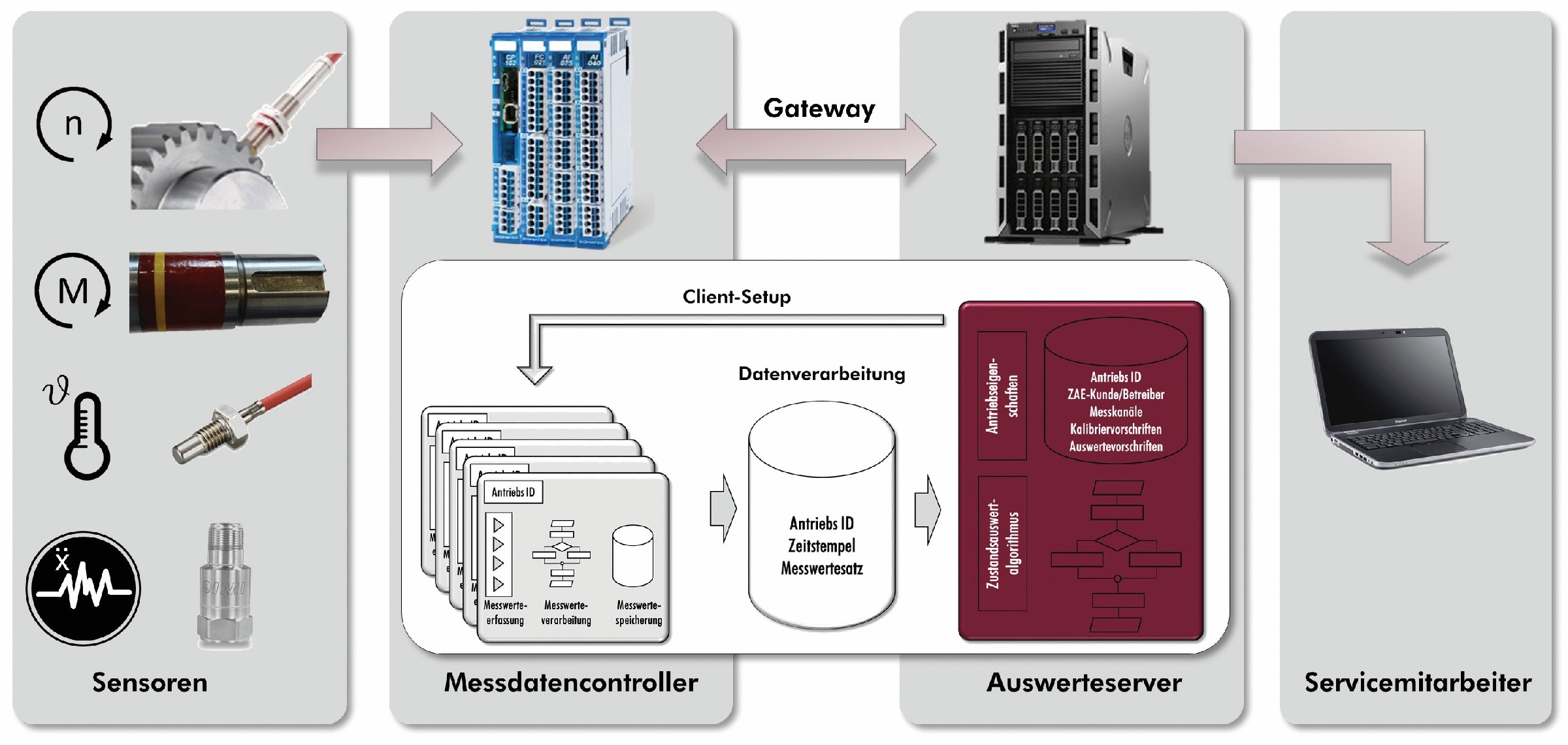 Insbesondere Messungen im Feld werden im Kontext mit IoT beziehungsweise Industrie 4.0 und den damit verbundenen Entwicklungen im Bereich der IT immer besser realisierbar. Sehr viele Daten (Big Data) können auf leistungsfähigen Servern gesammelt und verarbeitet werden. Für die Internetgateways stehen bezahlbare Hardware und IoT-Protokolle zur Verfügung. Vor Ort können mittels echtzeitfähiger, modularer Controllersysteme Messdaten erfasst und vorverarbeitet werden, die von dort auf die Server gesendet werden. Die fortschreitende Entwicklung in der Messtechnik ermöglicht gut integrierbare, bezahlbare Sensoren für alle relevanten Messgrößen an einem Industrieantrieb. Ein internetbasiertes Predictive Maintenance-System kann darauf aufbauend ermöglicht werden. Immer wieder fragen Kunden nach Lösungen für die Aufgabenstellungen einer permanenten Antriebs- und Anlagenüberwachung aus der Ferne, die möglichst automatisiert Diagnosen und Alarme generiert. ZAE-AntriebsSysteme entwickelt derzeit mit gutem Fortschritt an einer eigenen Lösung auf diesem Gebiet, die den Namen „ZAE-DriveWatch“ trägt (Bild 1), [2].