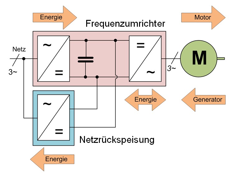 Die Haupteigenschaft der Rück- speiseeinheit besteht darin, dass eine spezielle Rückspeiseschaltung direkt an einen beliebig großen Zwischenkreis angeschlossen werden kann, die generatorische Leistung über einen eigenen Netzstromrichter autark ins Netz einspeist.