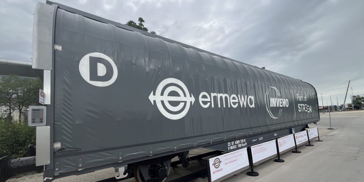 Demonstratorwagen von Ermewa, der das automatisches Planensystem für Güterwagen auf der Messe transport logistic in München gezeigt hat.