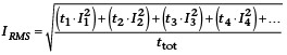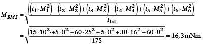 Lassen wir den Motor mit dem vorgegebenen Belastungszyklus laufen, so ist dies aus thermischer Sicht äquivalent mit einem Dauerbetrieb mit dem Effektivwert oder RMS-Wert der Belastung. Einsetzen der Drehmomente in die Berechnungsformel ergibt: