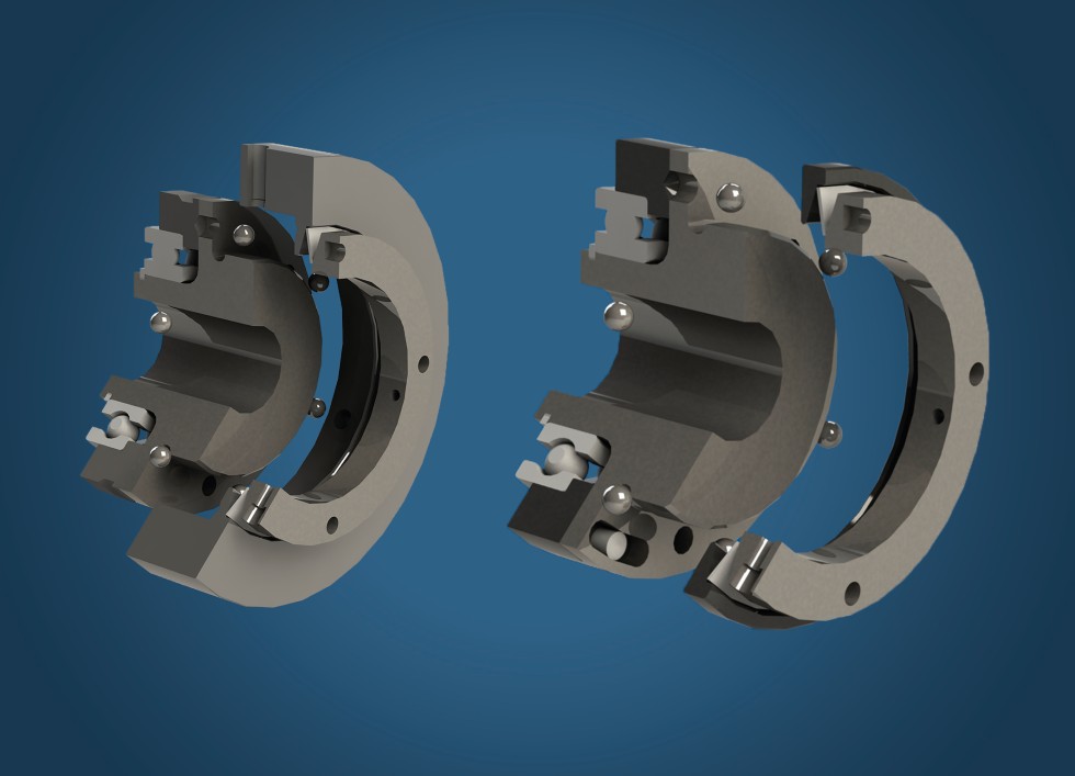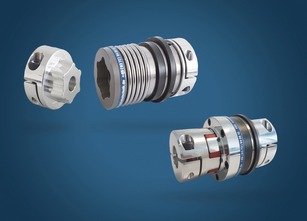 KBK fertigt auch Überlastkupplungen mit Metallbalg (li). Die Sicherheitskupplungen in Halbschalen-Bauweise sind sogar einzigartig auf der Welt: Sie ermöglichen die optimale Ausrichtung der Welle und helfen Fluchtungsfehler zu vermeiden.