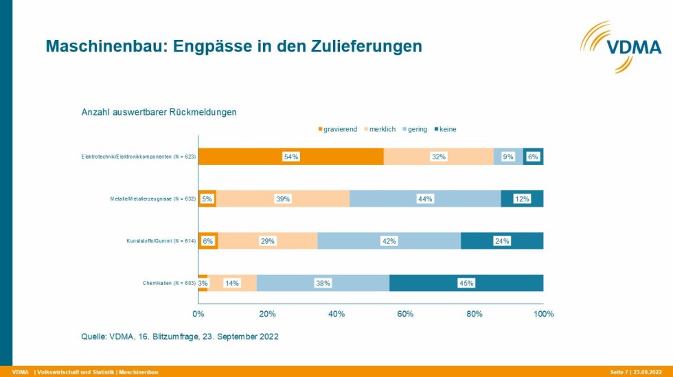 Die Situation in den Lieferketten bleibt weiterhin herausfordernd. „Immer noch melden rund vier von fünf Unternehmen merkliche oder gravierende Beeinträchtigungen in ihren Lieferketten, und nur wenige Maschinenbauer erwarten eine nachhaltige Entspannung in den nächsten Monaten“, sagt Wiechers. Lediglich die Versorgungslage bei Metallen und Metallerzeugnissen hat sich zuletzt deutlich verbessert. Die Mehrheit der Unternehmen meldet hier geringe oder gar keine Engpässe in den Zulieferungen. Ganz anders sieht es bei den Elektronikkomponenten aus. Jedes zweite Unternehmen hat bei Elektronikkomponenten weiterhin gravierende Engpässe. Und auch die Aussichten sind hier sehr schlecht. Rund drei Viertel der Unternehmen erwarten eine Entspannung frühestens im zweiten Halbjahr 2023.