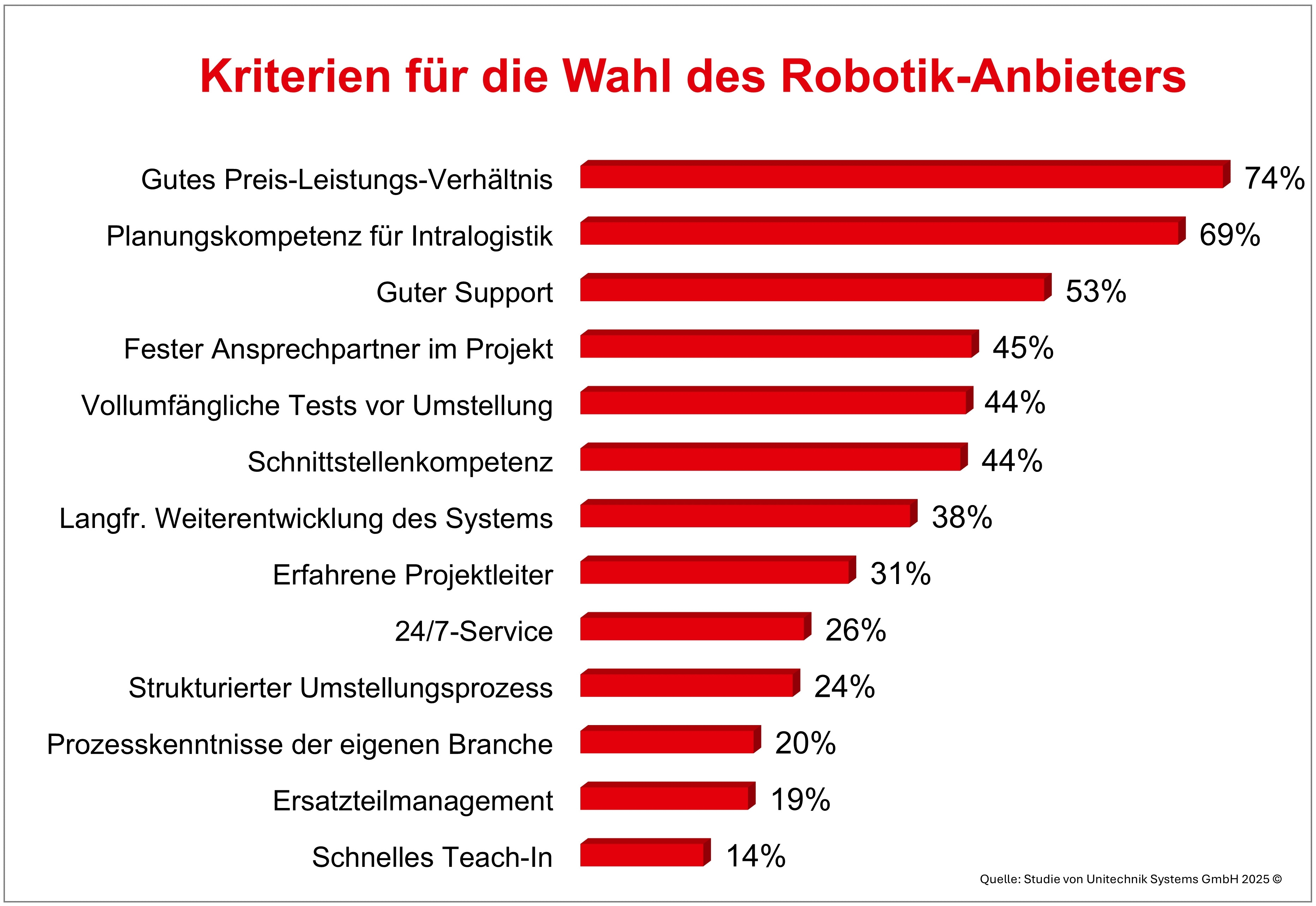 Bei der Auswahl des richtigen Partners für ein Robotikprojekt zeigt sich ein klares Bild: Die meisten Unternehmen bevorzugen spezialisierte Systemintegratoren, gefolgt vom Generalunternehmer für die Gesamtanlage. Nur wenige setzen direkt auf Roboterhersteller. Ausschlaggebend ist dabei die hohe Komplexität der Integration. Roboter müssen in bestehende Materialflüsse, Lagerverwaltungen und IT-Strukturen eingebunden werden. Genau an dieser Stelle entscheidet sich, ob ein Projekt erfolgreich läuft. Die Anforderungen an Partner für Robotikprojekte sind entsprechend hoch. Unternehmen erwarten mehr als reine Technik. Gefragt sind Anbieter, die Prozesse verstehen, Schnittstellen sicher beherrschen und ihre Kunden über alle Projektphasen hinweg begleiten. Außer dem hohen Anteil der Befragten, die sich ein gutes Preis-Leistungs-Verhältnis wünschen (74 %), fallen insbesondere die folgenden Aspekte ins Gewicht. Laut Studie legen 69 % der Befragten besonderen Wert auf eine fundierte Planungskompetenz für Logistik und Materialfluss. Wichtig ist die Fähigkeit, individuelle Anforderungen präzise zu analysieren und daraus im Kontext des logistischen Gesamtsystems passende Lösungen zu entwickeln. Konkrete Vorstellungen über den Projektablauf werden formuliert, indem sich 45 % einen festen Ansprechpartner im Projekt wünschen und 44 % der Befragten den Go-live mit vollumfänglichen Tests absichern wollen. Nach der Implementierung erwarten die Befragten einen guten Support (53 %), die langfristige Weiterentwicklung des Systems (38 %) und einen 24/7-Service (26 %).