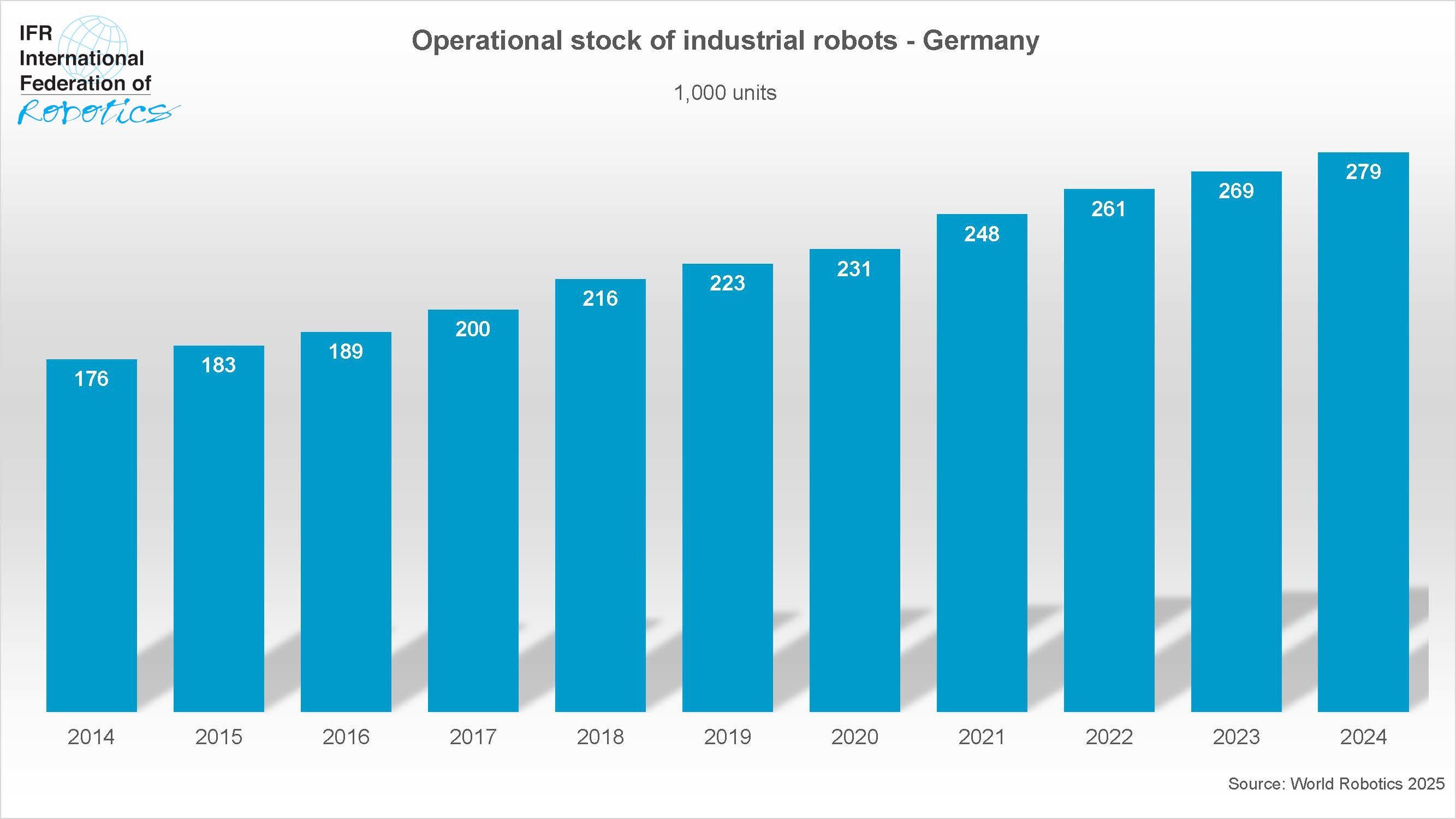 China ist im Jahr 2024 mit einem globalen Anteil von 54 % aller Einheiten der größte Robotermarkt weltweit. Mit 295.000 Stück nahm die chinesische Industrie die höchste jemals in einem Jahr installierte Zahl an Robotern in Betrieb. Zum ersten Mal verkauften chinesische Hersteller dabei mehr Roboter im eigenen Land als ausländische Anbieter. Der Marktanteil stieg auf 57 % und übertraf damit deutlich die Quote früherer Jahre, die vor 10 Jahren noch bei 28 % lag. Chinas operativer Bestand an Industrie-Robotern überschritt 2024 die Marke von 2 Millionen Einheiten – ebenfalls ein weltweiter Rekord.