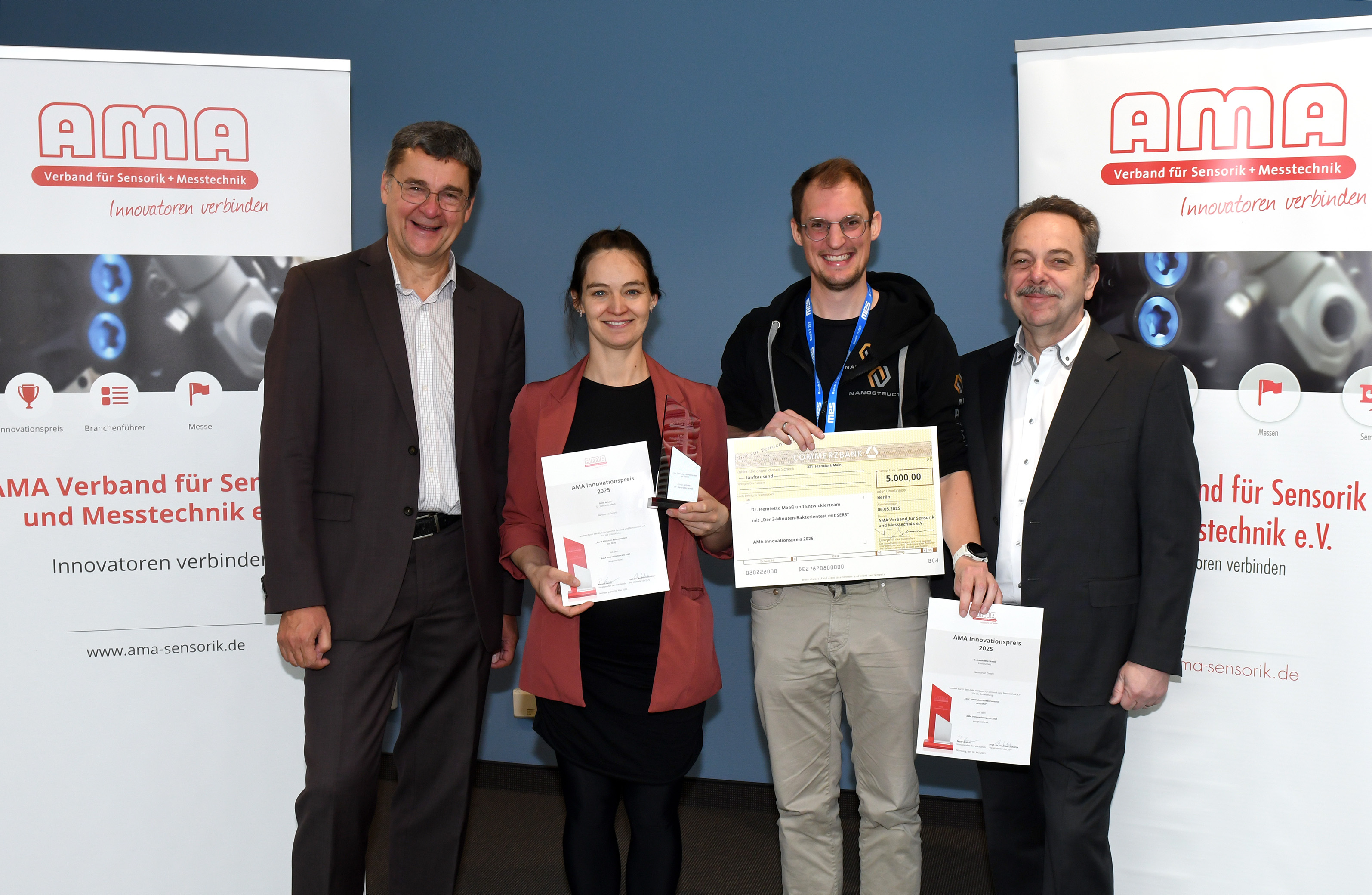 Der AMA Verband für Sensorik und Messtechnik hat zwei herausragende Entwicklerteams mit dem AMA Innovationspreis 2025 ausgezeichnet. Wie der Verband mitteilt, sind die diesjährigen Gewinner die Entwicklerteams der NanoStruct GmbH aus Würzburg, ein junges Unternehmen aus dem universitären Umfeld sowie das Entwicklerteam der etablierten Endress+Hauser Flow aus der Schweiz. Beide Teams überzeugten die unabhängige Jury aus Wissenschaft und Industrie gleichermaßen. Das Preisgeld in Höhe von 10.000 Euro wird zwischen den beiden Gewinnern aufgeteilt.