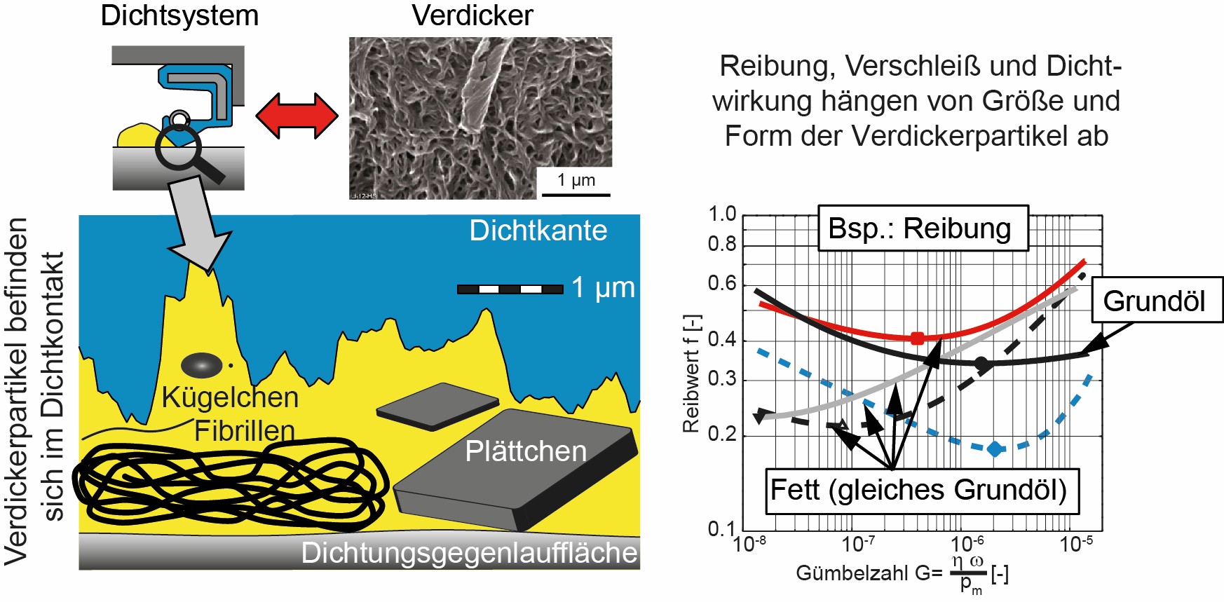 Schmierfette bestehen aus Flüssigkeit (Grundöl) und Festkörper (Verdicker). Daraus folgen andere Verhältnisse im Dichtkontakt als bei der Abdichtung von Ölen. Das Schmierfett wird mit hohen Scherraten belastet. Diese führen zur Zerstörung der Verdickerstruktur. Im Dichtkontakt befinden sich als Folge dessen Grundöl und Verdickerpartikel aus der zerstörten Struktur. Die Größe der Partikel liegt in der Größenordnung der Dichtspaltgeometrie. Daher beeinflussen sie Reibung, Verschleiß und Dichtwirkung nachhaltig [4].