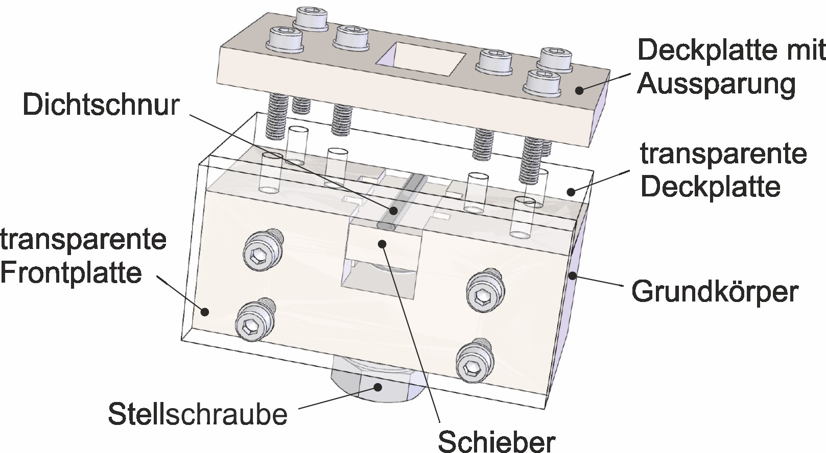 Er besteht aus einem quaderförmigen Grundkörper, in dessen Nut ein Schieber aus Acrylglas über eine Stellschraube bewegt werden kann. Um ein Verkippen zu verhindern, läuft er seitlich in je zwei Führungsnuten. Die Dichtschnur wird über diesen Schieber gegen die transparente Deckplatte aus Acrylglas verpresst. Zur Er-höhung der Steifigkeit wird eine zusätzliche Deckplatte aus Aluminium angebracht. Eine Aussparung in dieser Platte ermöglicht den Blick von oben auf die verpresste Elastomerdichtung. Durch die geradlinige Ausrichtung der runden Dichtschnur kommt es im Vergleich zur ringförmigen Anordnung zu Abweichungen im Verformungsverhalten. Dies dürfte allerdings nur bei sehr kleinem Innendurchmesser D relevant sein. Dafür bietet sich die Möglichkeit, den verformten Profilquerschnitt zu betrachten. An ihren Stirnflächen würde sich die Dichtschnur aufgrund der ungehinderten Ausdehnungsmöglichkeit in axialer Richtung anders verformen. Um dies zu verhindern, liegt die Elastomerdichtung an einer transparenten Frontplatte aus Acrylglas an.