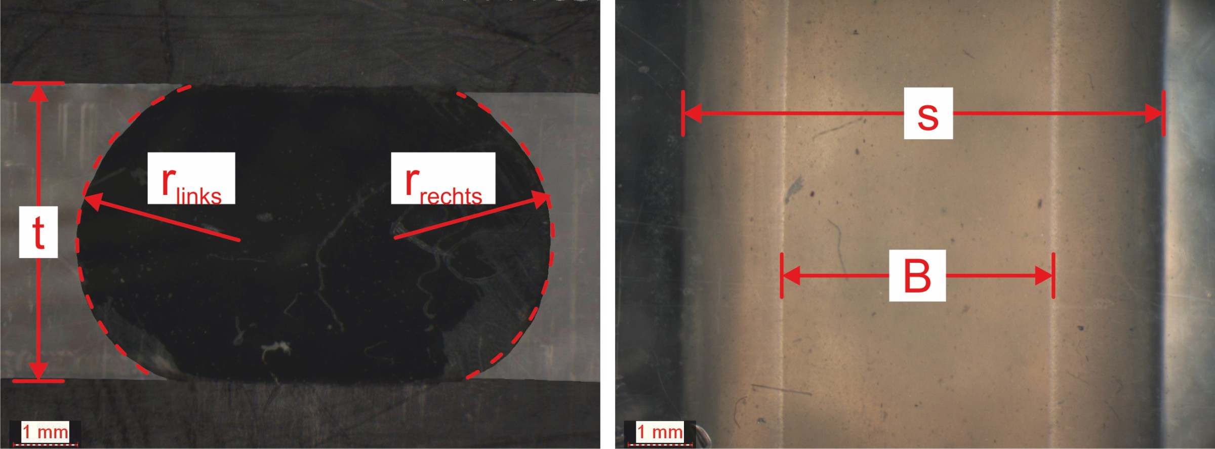 Dieser Aufbau ermöglicht es, die Geometrie der Dichtung bei variabel einstellbaren Verpressungsgraden unter dem Lichtmikroskop zu betrachten und zu vermessen. Bild 5 zeigt Mikroskopaufnahmen eines verpressten O-Rings. Das linke Bild wurde durch die transparente Frontplatte aufgenommen. Hier kann der Radius r des Kreissegments sowie die Höhe t des verformten O-Rings gemessen werden. Über die Dichtungshöhe t lässt sich mit den Gln. (2) und (3) die Verpressung berechnen. Bild 5 rechts zeigt eine durch die transparente Deckplatte gemachte Aufnahme. Sie dient zur Ermittlung der Berührbreite B und der verpressten Dichtungsbreite s.