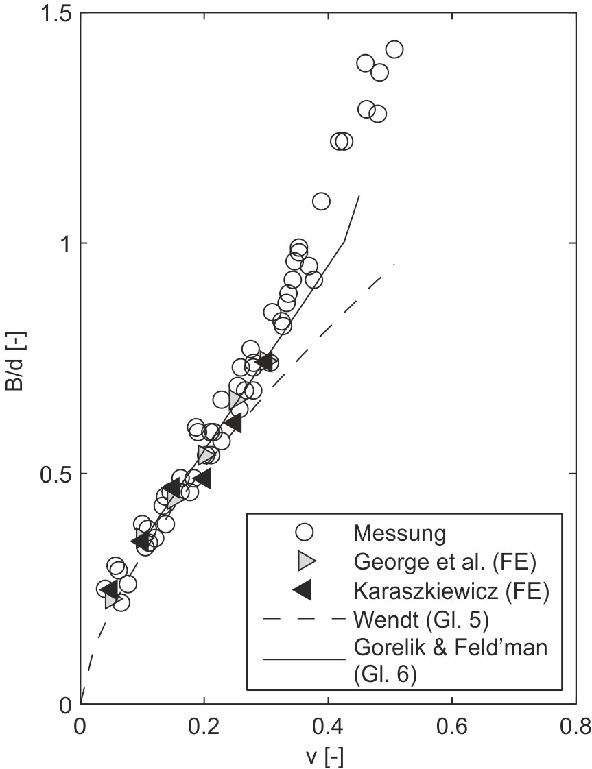 Gl. (6) stellt eine von Gorelik und Feld’man vorgeschlagene Methode dar, die auf den Schnurdurchmesser normierte Berührbreite in Abhängigkeit von der Verpressung zu ermitteln. Dieser Ansatz ist mit der von Jagger und Walker vorgeschlagenen Formel identisch [10].