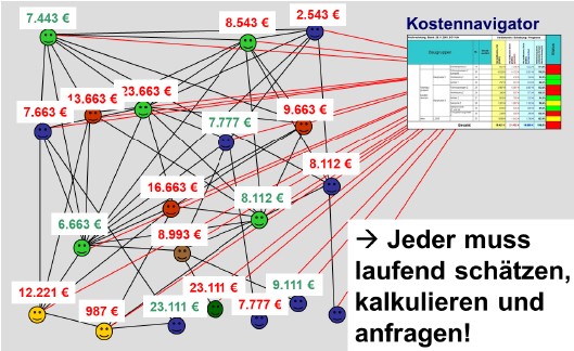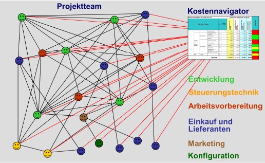 ProWerk setzt im Zielkostenmanagement den Kostennavigator ein, mit dem die Herstellkosten für eine Maschine während der gesamten Entwicklungsdauer von Beginn des Projektes an prognostiziert werden. Somit können von Beginn an die Kostentreiber identifiziert und entsprechend behandelt werden. In ein Zielkostenprojekt werden neben der Entwicklungsabteilung auch die anderen Abteilungen aus dem Unternehmen, die einen Anteil an den Herstellkosten haben, beteiligt (siehe auch Bild 2).