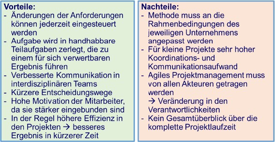 Es hat sich gezeigt, dass in der Software-Entwicklung außerordentliche Effizienzgewinne in den Projekten erzielt wurden [5]. Nun lässt sich diese agile Methode prinzipiell auch für alle anderen Bereich außerhalb der Softwareentwicklung nutzen. Welche Vor- und Nachteile ergeben sich daraus?