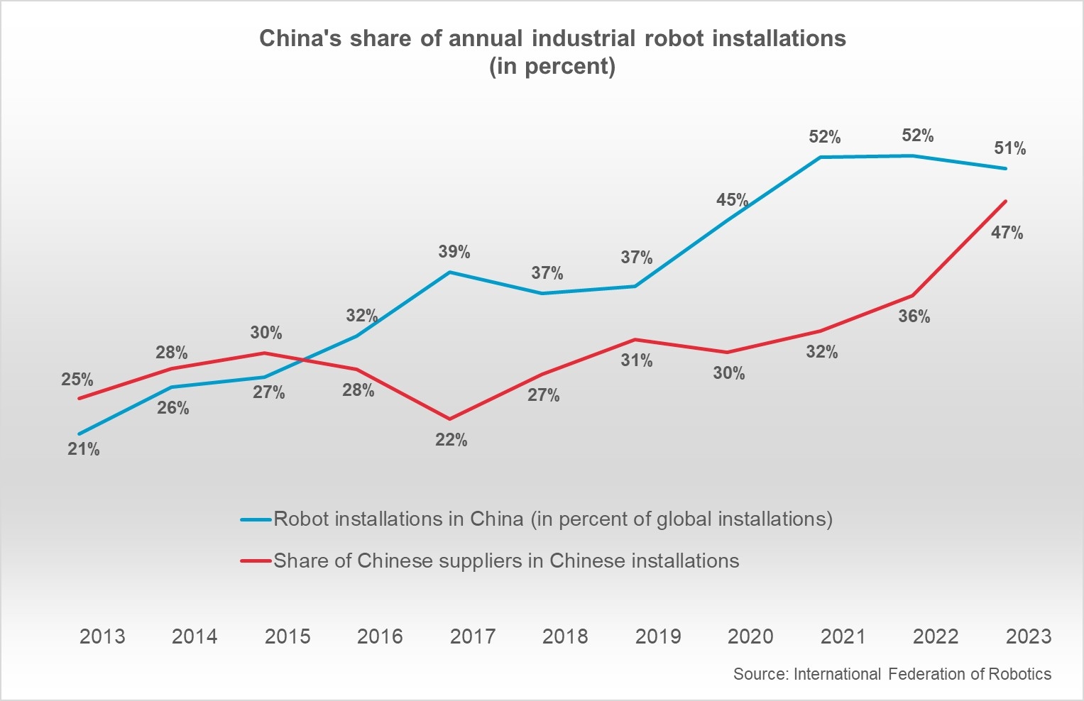Den Roboterherstellern aus China ist es nach IFR-Angaben gelungen, ihre Wettbewerbsposition im Heimatmarkt deutlich auszubauen: So stieg der Anteil der von lokalen Anbietern installierten Industrieroboter von 30 % im Jahr 2020 auf 47 % im Jahr 2023.