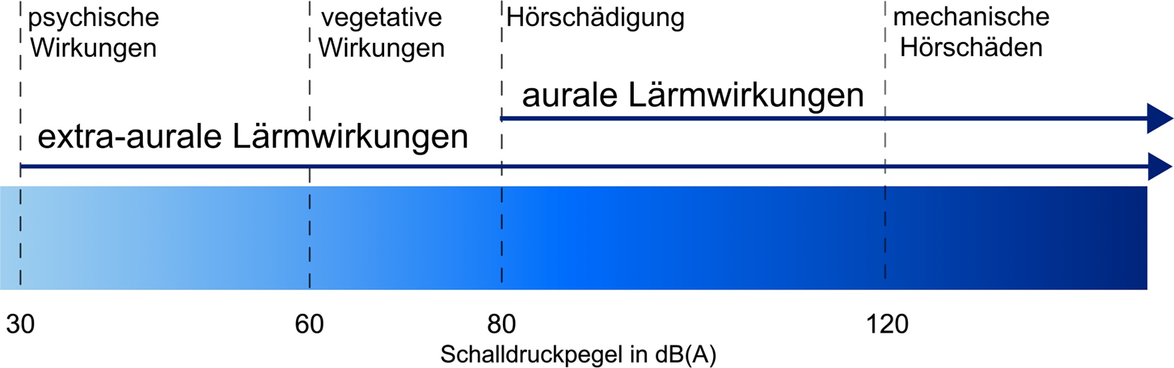 Eine Lärmschwerhörigkeit kann eintreten, wenn man sein Gehör regelmäßig zu lauten Situationen aussetzt oder auch nur durch ein extrem lautes Ereignis. Im Merkblatt zu der Berufskrankheit Nr. 2301 der Anlage zur Berufskrankheiten-Verordnung: Lärmschwerhörigkeit, sind diese Pegel und ihre Einwirkzeit definiert. Demnach entsteht über die Jahre hinweg eine Lärmschwerhörigkeit, wenn der Tageslärmexpositionspegel den Wert von 85 dB(A) überschreitet. Solche Pegel misst man mit dem Filter A, da dieser die Empfindungsfähigkeit des menschlichen Ohres annähernd nachbildet. Wirkt dieser Pegel entweder über die klassischen acht Arbeitsstunden pro Tag auf das Gehör ein, oder ist er diesem, bei zeitlich schwankenden Pegel, gleichgesetzt muss der Arbeitgeber besondere Schutzmaßnahmen vornehmen, da ansonsten eine beidseitige chronische Schwerhörigkeit höchstwahrscheinlich auftreten wird. Gleiche Gefahr gilt für Spitzenschalldruckpegel von mehr als 137 dB(C) von sehr kurzer Dauer, die unterhalb von 10 ms liegt. Die dB(C)-Bewertung dient zur Beurteilung von Störungen und beachtet Bassgeräusche mehr als die dB(A)-Bewertung. Solche impulshaften Geräusche treten beispielsweise beim Richten von Metall mit Hammerschlägen, beim Schießen oder durch Explosionen auf und können das Gehör selbst bei nur einmaligen Auftreten so schädigen, dass eine irreversible Schwerhörigkeit zurückbleibt. Bei diesem sogenannten Knall- oder Explosionstrauma werden unter anderem die Haarsinneszellen des Innenohres mechanisch zerstört.