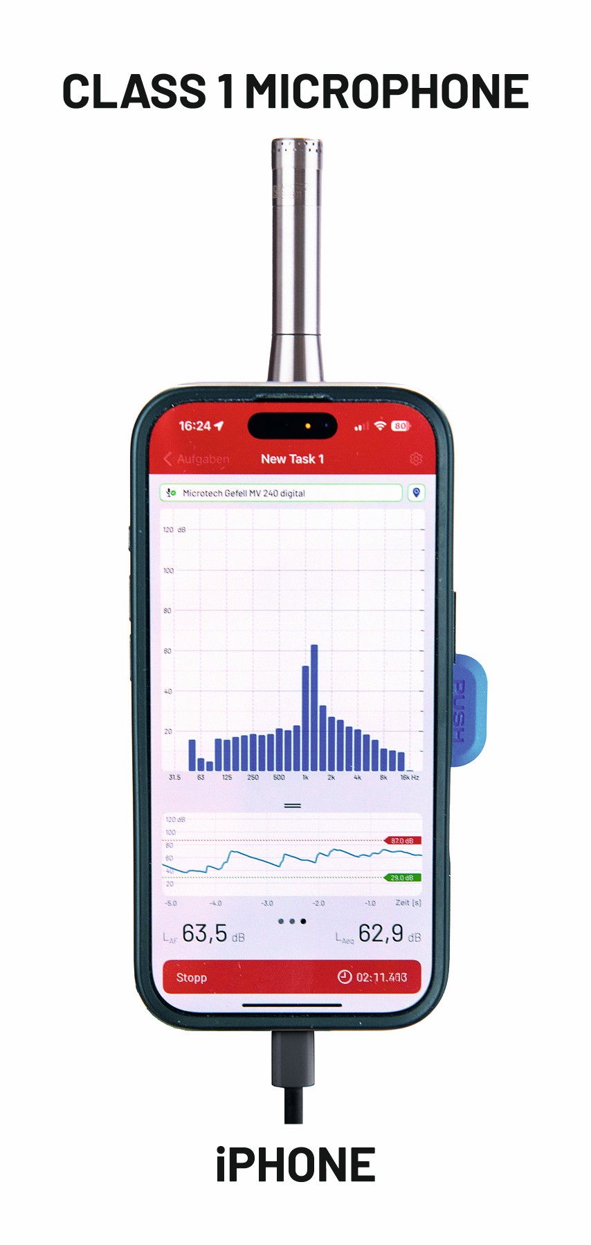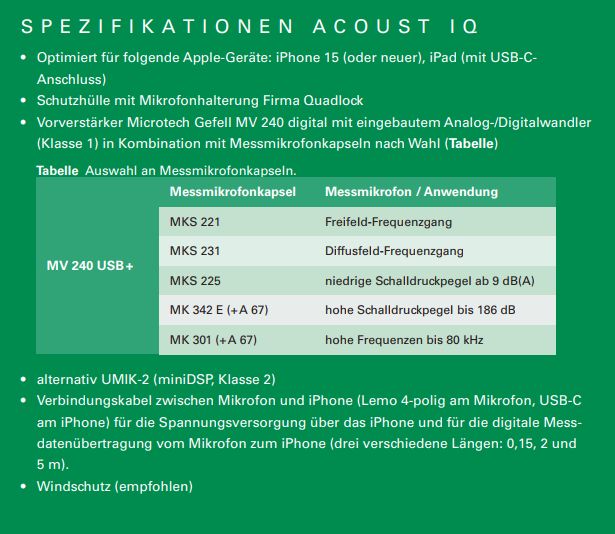 Der beschriebene Lösungsansatz besteht im Fall von acoust IQ aus folgenden Komponenten: Einem iPhone beziehungsweise iPad mit USB-C-Anschluss, einem Klasse-1-Mikrofon mit digitalem Vorverstärker der Firma Microtech Gefell sowie der speziell entwickelten App acoust IQ.