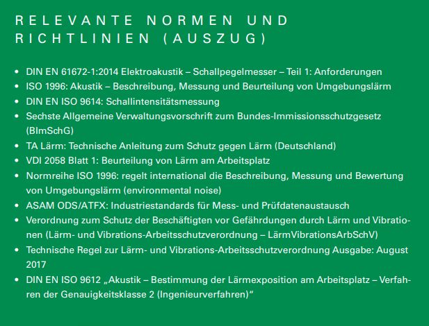Eine nahtlose Integration in vorhandene Normen und Prüfstrukturen ist im Rahmen dieses Ansatzes durchweg gegeben. Die eingesetzte Messtechnik erfüllt die Anforderungen der Klasse 1 nach DIN EN 61672-1:2014 / -2:2018. Auch bei der Analyse der erfassten Daten werden die relevanten Normen berücksichtigt, darunter die internationale Normreihe ISO 1996 „Description, measurement and assessment of environmental noise“ zur Beschreibung und Messung von Umgebungslärm.