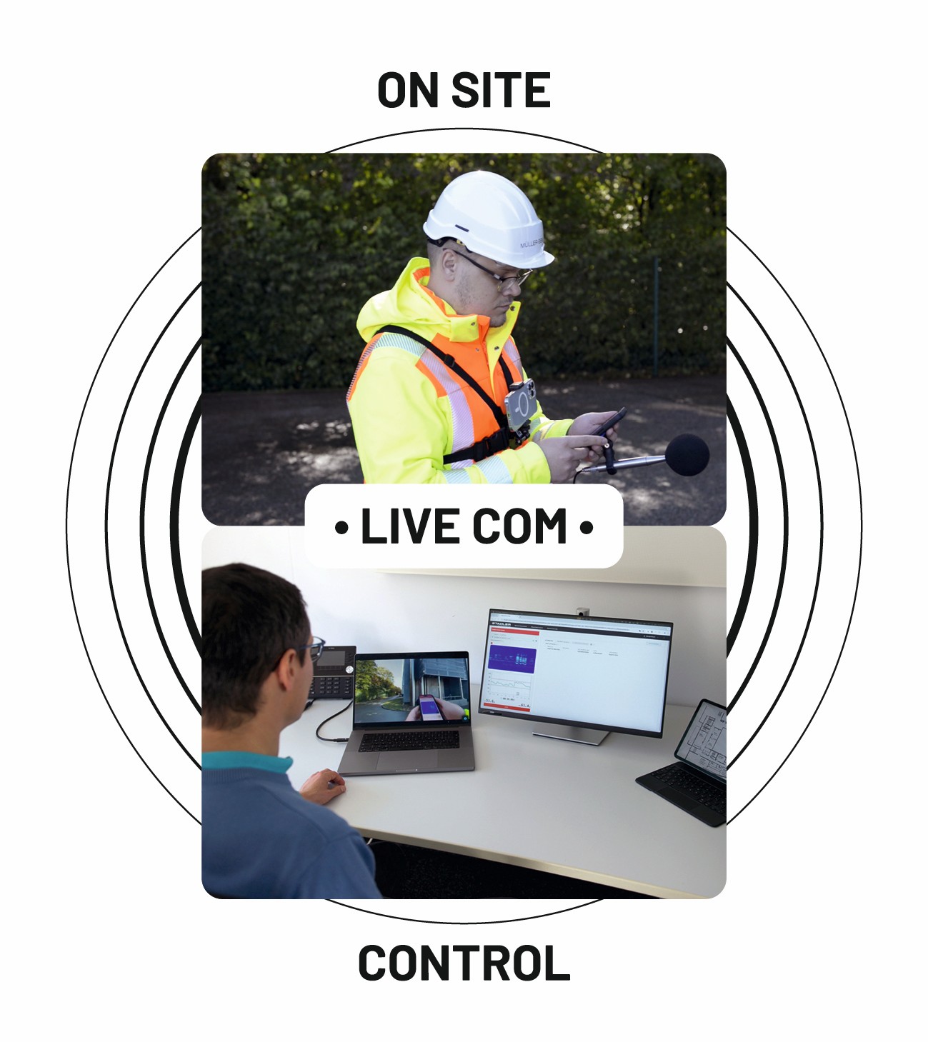 In einer weiteren Ausbaustufe (acoust IQ live) wird die Funktion zur webbasierten Fernsteuerung von Messungen ermöglicht. Dies umfasst zum einen die Durchführung und Überwachung von Kurzzeitmessungen, ortsunabhängig und flexibel in Bezug auf Dauer und Art der Messaufgabe als auch Monitoring-Messungen über einen längeren Zeitraum. Damit entfallen Reisen zu Anlagen und die damit verbundenen Zeit- und Kostenaufwände. In der Praxis übernimmt eine Person vor Ort, die lediglich über grundlegendes technisches Verständnis verfügen muss, die Bewegung des Mikrofons zum spezifischen Prüfobjekt und gegebenenfalls während der Messung auch in dessen Umgebung. Die Steuerung der Messung selbst erfolgt über einen Webbrowser. Die Durchführung ist damit plattformunabhängig und kann von Expertinnen und Experten aus der Ferne durchgeführt werden. Es ist keine zusätzliche Hardware erforderlich. Vor Ort werden die bereits beschriebenen mobilen Endgeräte wie iPhone oder iPad in Verbindung mit einem angeschlossenen Klasse-1-Mikrofon verwendet. Parallel zur Steuerung der Messung aus der Ferne kann über ein beliebiges Video-Call-System die Positionierung des Mikrofons überwacht und ein Eindruck von der Messumgebung gewonnen werden.