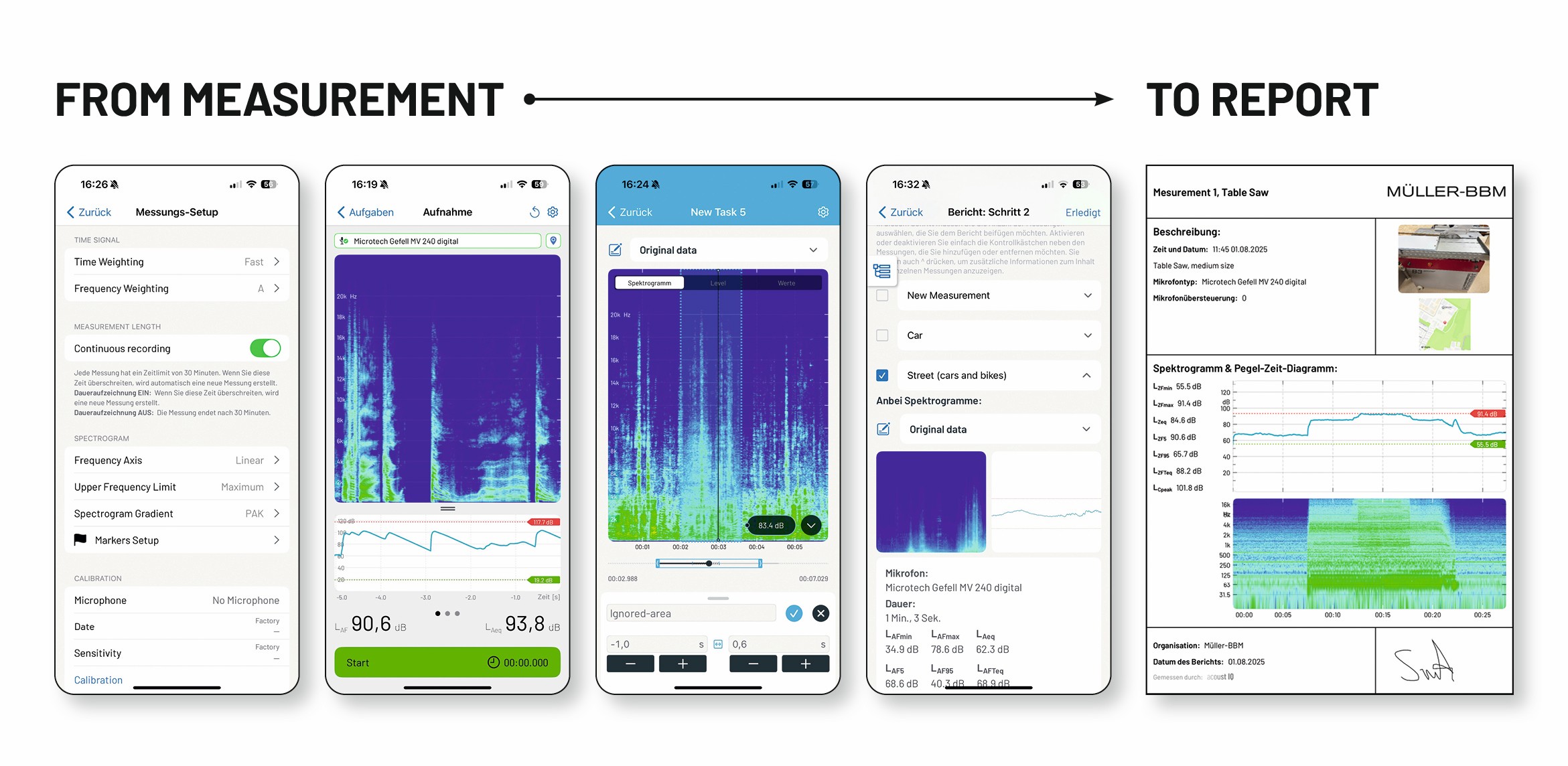 Für die Auswertung der Daten bietet das System die Möglichkeit, die Messungen nachträglich anzuhören und relevante Zeitabschnitte nicht-destruktiv ein- oder auszuschließen. Die erfassten Daten lassen sich normkonform weiterverarbeiten, einschließlich der Umrechnung, Bewertung und Erstellung zusammenfassender Kennwerte gemäß den jeweils geltenden Anforderungen. Für die Dokumentation steht ein integrierter, template-basierter Report-Generator zur Verfügung. Er erstellt Prüfprotokolle, die neben den ausgewerteten Messdaten auch alle zugehörigen Metadaten, Signaturen, den Messort und Bildmaterial enthalten.