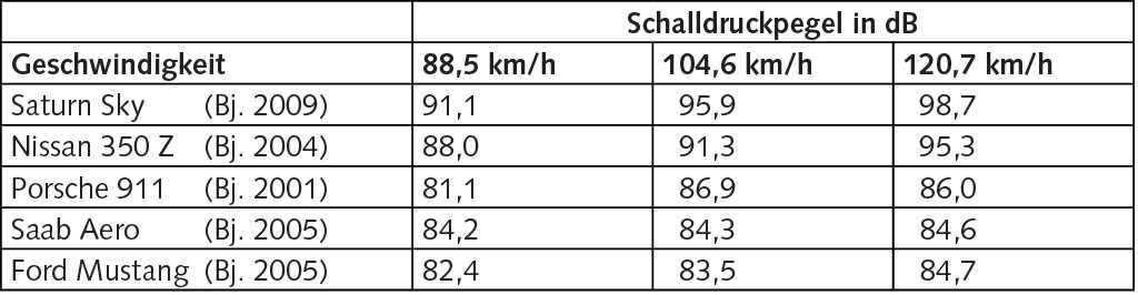Die in der Tabelle für die offenen Cabriolets mit versenkten Seitenfenstern zusammengestellten Messergebnisse sollten damit also um ca. 2 bis 3 dB(A) zu hoch ausfallen.