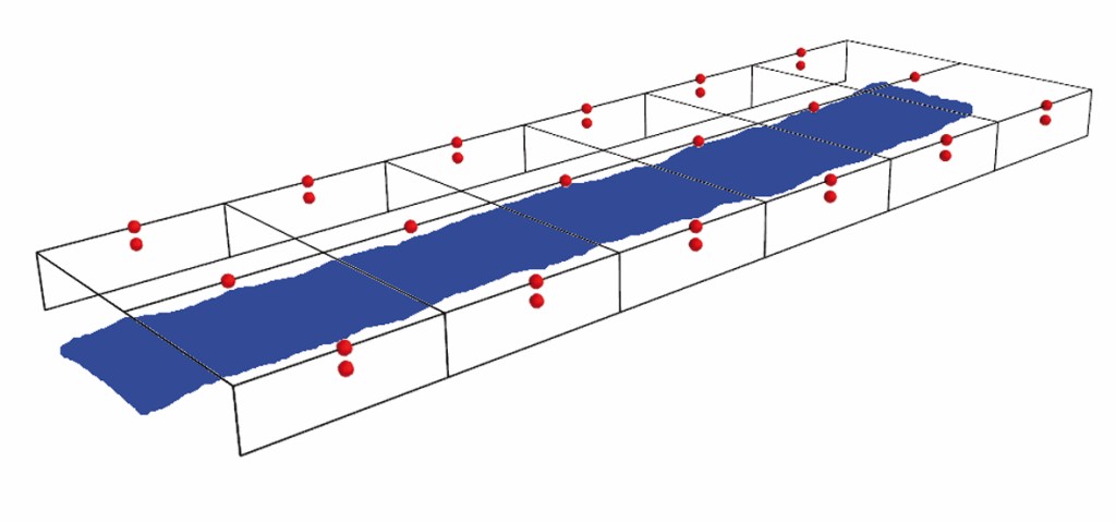 Bild 3 zeigt schematisch die für die Messung an der Fischaufstiegsanlage Steinteichmühle verwendete Messfläche inklusive der Mikrofonpositionen.