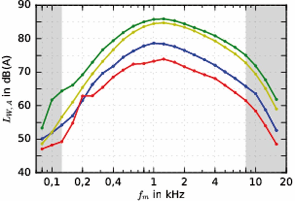 Aus den Einzelschallleistungspegeln bei den Terzmittenfrequenzen von 80 Hz bis 16 kHz wurde anschließend der A-bewertete Gesamtschallleistungspegel berechnet. Dieser ist in Bild 5 dargestellt.