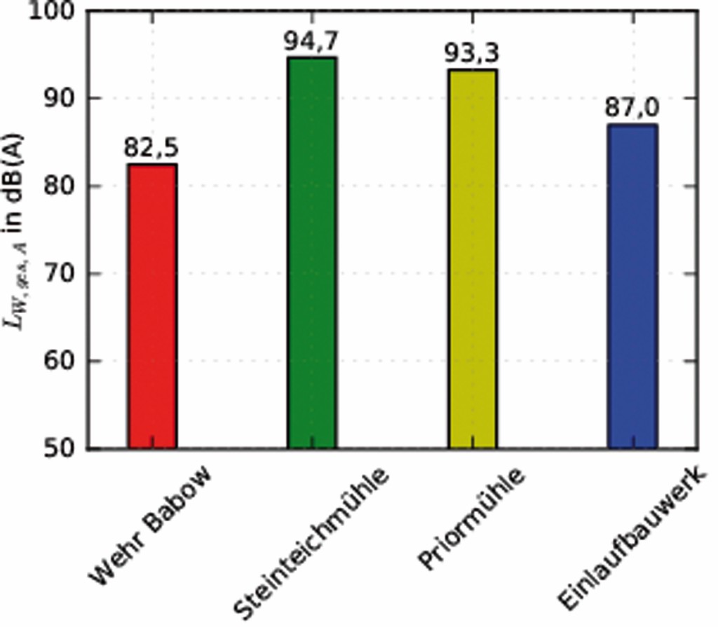 Es ist ersichtlich, dass der spektrale Verlauf bei allen Anlagen grundsätzlich ähnlich ist: Die Schallleistung steigt von tiefen zu mittleren Frequenzen an (mit etwa 10 bis 12 dB(A) pro Frequenzverdopplung) und erreicht dann bei etwa 1 000 bis 1 250 Hz das Maximum. Anschließend fällt der Schallleistungspegel mit weiter steigender Frequenz wieder ab (mit etwa 6 bis 8 dB(A) pro Frequenzverdopplung). Der höchste Schallleistungspegel wurde dabei für die Fischaufstiegsanlage Steinteichmühle gemessen, das Maximum beträgt hier 85,9 dB(A). Die geringste Schallleistung mit einem Spitzenwert von 73,9 dB(A) ergibt sich für das Wehr Babow; dies ergibt eine deutliche Differenz von 12 dB(A) gegenüber der Steinteichmühle. Das gemessene Schallleistungsspektrum des Wehrs in Babow zeigt neben dem globalen Maximum bei 1 250 Hz noch ein weiteres lokales Maximum bei etwa 200 Hz. Dieses Schallleistungsmaximum kommt durch einen sehr hohen Schalldruckpegelmesswert an der Messposition auf dem Bediensteg zustande, der sich direkt oberhalb des Wehrüberfalls befand. Bereits während der Messungen ist subjektiv festgestellt worden, dass die Lautstärke an dieser Position vergleichsweise hoch ist.