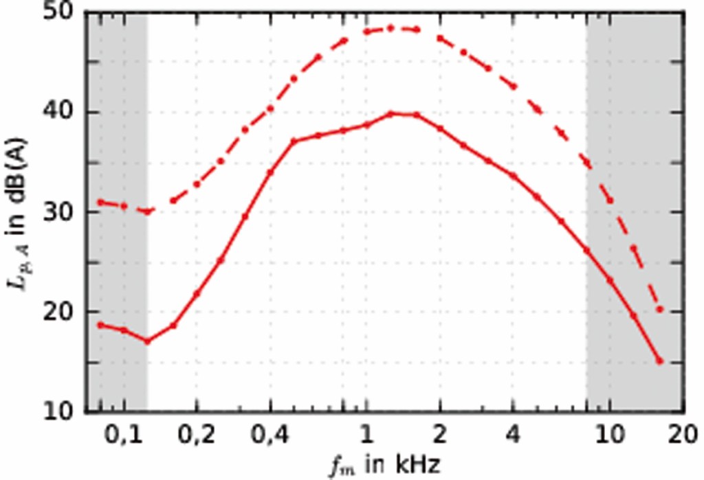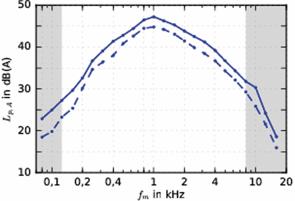 Alle akustischen Messungen wurden mit einem Handschallpegelmessgerät der Klasse 1 und einem 1/4‘‘-Messmikrofon der Klasse 2 durchgeführt, das mit einem Windschutz versehen war. Die Messdauer betrug mindestens 30 s, in ausgewählten Fällen 60 s. Laut Norm sind die Messungen in Terzbändern mit Mittenfrequenzen von 125 Hz bis 8 kHz durchzuführen. Da die Ergebnisse auch bei etwas tieferen und höheren Frequenzen plausibel erschienen, wurden in der vorliegenden Studie eine untere Frequenzgrenze von 80 Hz und eine obere Frequenzgrenze von 16 kHz gewählt. Im Sinne einer angestrebten Modellbildung erlaubt dies zumindest grobe Aussagen auch über den in der Norm festgelegten Bereich hinaus.