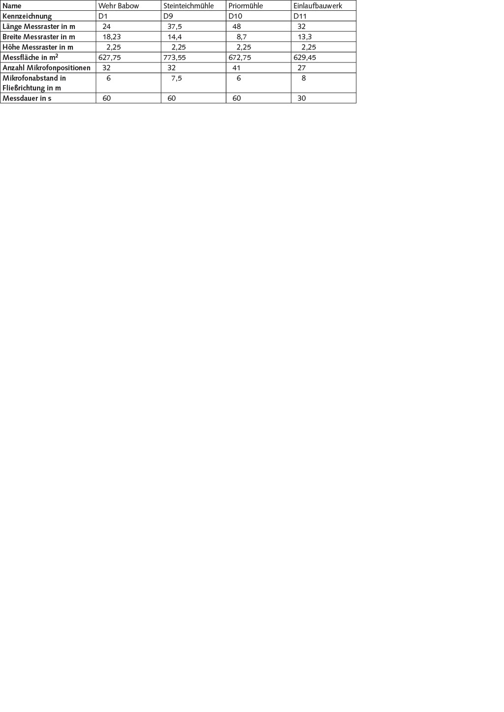 Obwohl eine Messung nach dem Hüllflächenverfahren (zweite Möglichkeit) bei vielen wasserwirtschaftlichen Anlagen aufgrund deren Größe und einer unter Umständen begrenzten Zugänglichkeit sehr aufwendig ist, bietet sie den Vorteil, dass auch eine nach oben gerichtete Schallemission berücksichtigt wird. In der vorliegenden Studie wurde daher die Schallleistung der unterschiedlichen Anlagen mithilfe des Hüllflächenverfahrens in Anlehnung an DIN EN ISO 3746 [4] durchgeführt. Zu diesem Zweck wurde um die Anlagen jeweils eine etwa quaderförmige Hüllfläche definiert, auf der die Mikrofone positioniert wurden. Beidseitig der Anlagen wurde das Mikrofon dabei in zwei unterschiedlichen Höhen von 1,55 und 2,25 m aufgestellt. Aufgrund der Größe und der zum Teil beschränkten Zugänglichkeit der Anlagen war es jedoch nicht in jedem Fall möglich, die über den Anlagen befindlichen Messpunkte ebenfalls ideal gleichmäßig zu verteilen. Die vorliegende Studie ist daher lediglich als Vorabuntersuchung der Durchführbarkeit von Schallemissionsmessungen an solchen Bauwerken zu verstehen. Tabelle 2 gibt eine Übersicht der für die akustischen Messungen verwendeten Messraster.