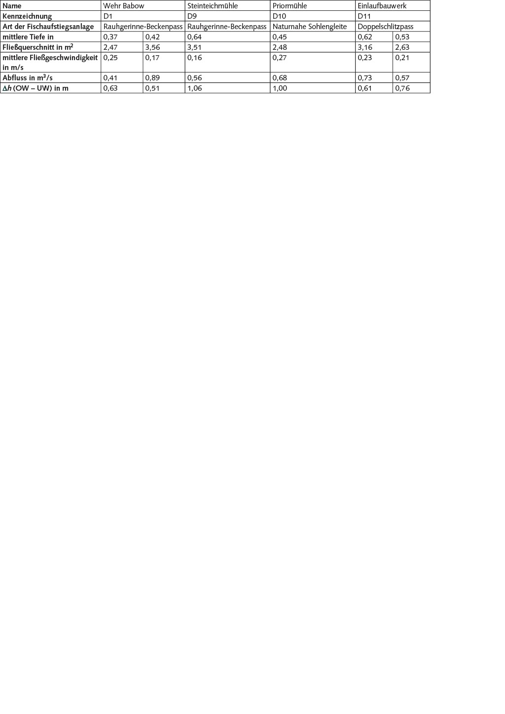 Die Abflussmessungen wurden mithilfe eines akustischen digitalen Strömungsmessers durchgeführt. Dabei wird die Fließgeschwindigkeit aus der Frequenzverschiebung eines ausgesendeten Ultraschallsignals bestimmt (Ultraschall-Doppler-Verfahren). Das verwendete Messgerät hat einen Messbereich von -0,2 bis 2,4 m/s, mit einer Genauigkeit von 1 % und einer Auflösung von 0,001 m/s. Gemessen wurde nach dem Prinzip des Messlotrechten-Verfahrens. Alle vorgenommenen Messungen erfolgten unter Berücksichtigung der geltenden Richtlinie für das Messen von Abflüssen [5]. An den regelbaren Wehranlagen erfolgte zusätzlich die Aufnahme der Ober- und Unterwasserstände (OW, UW) durch Ablesen der Lattenpegel. Für die naturnahe Sohlengleite resultierte die Höhendifferenz (h) zwischen Ober- und Unterwasser aus Nivelliermessungen.