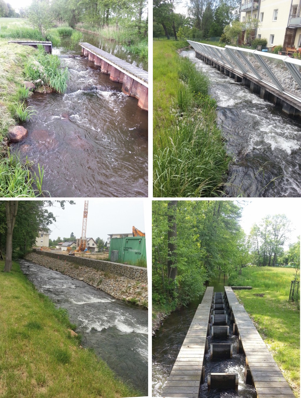 Die Anlagen Priormühle und Steinteichmühle sind naturnahe gestaltet, während das Einlaufbauwerk eine rein technische Anlage ist, die noch nicht in den naturnahen Zustand zurückversetzt wurde. Die Bilder 2 (a bis d) zeigen entsprechende Fotos der Bauwerke. In Bild 2(b) ist dabei zusätzlich die aufgrund von Anwohnerbeschwerden errichtete Lärmschutzwand zu sehen.