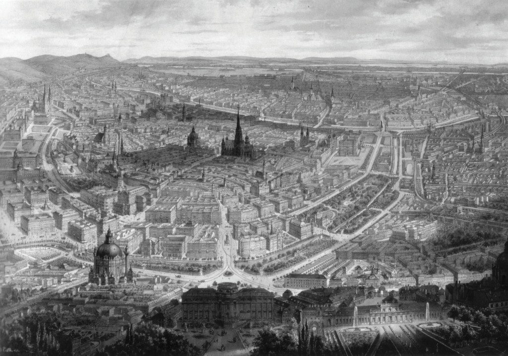 Nur mehr aus der Distanz, von einem Turm oder Berg aus, war die Totalität der Stadt einigermaßen fassbar, ihre Physiognomie somit erkenn- und darstellbar. In Wien sprach Adalbert Stifter angesichts der sich ins schier Unendliche ausdehnenden Masse an Häusern euphorisch vom „Häusermeer“, das sich zu seinen Füßen erstrecke, und von der „Riesenscheibe, die da wogt und wallt und kocht und sprüht und sich ewig rührt in allen ihren Teilen (Bild 1) [4].“