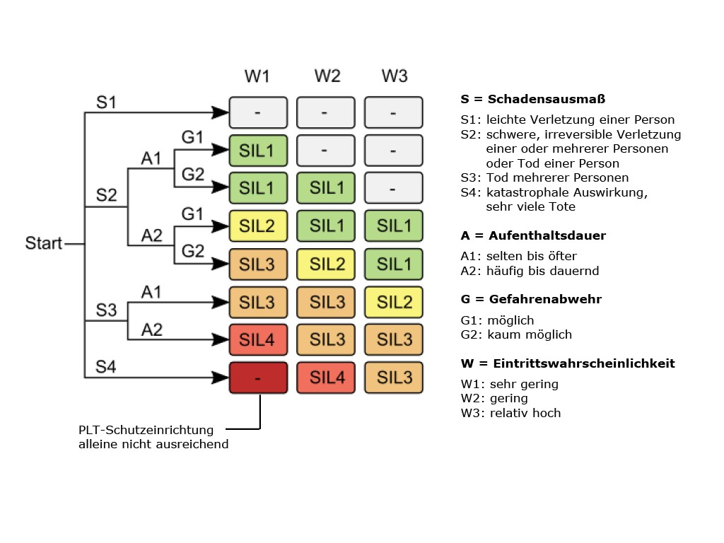 Die Einführung des Näherungsverfahrens zur Risikoabschätzung in Betrieben wird beträchtlich dadurch erleichtert, dass es sich Rasterung von S und W stark an die Regelwerke von VED/VDI 2180 [7] und SIL [8] anlehnt. Die relevanten Mitarbeiter kennen und beherrschen diese Methode; sie sind daher mit der Vorgehensweise und Anwendung des Risikonäherungsverfahrens nach SQP bereits vertraut. Allerdings ist damit auch ein Nachteil verbunden: Bei der Bestimmung der Risikokennziffer Rn kann sich bei der Risikoabschätzung auch R0 ergeben – bei oberflächlichem Sprachgebrauch also scheinbar ein Risiko Null. Letzteres ist natürlich nicht richtig; dieser Eindruck darf nicht entstehen.