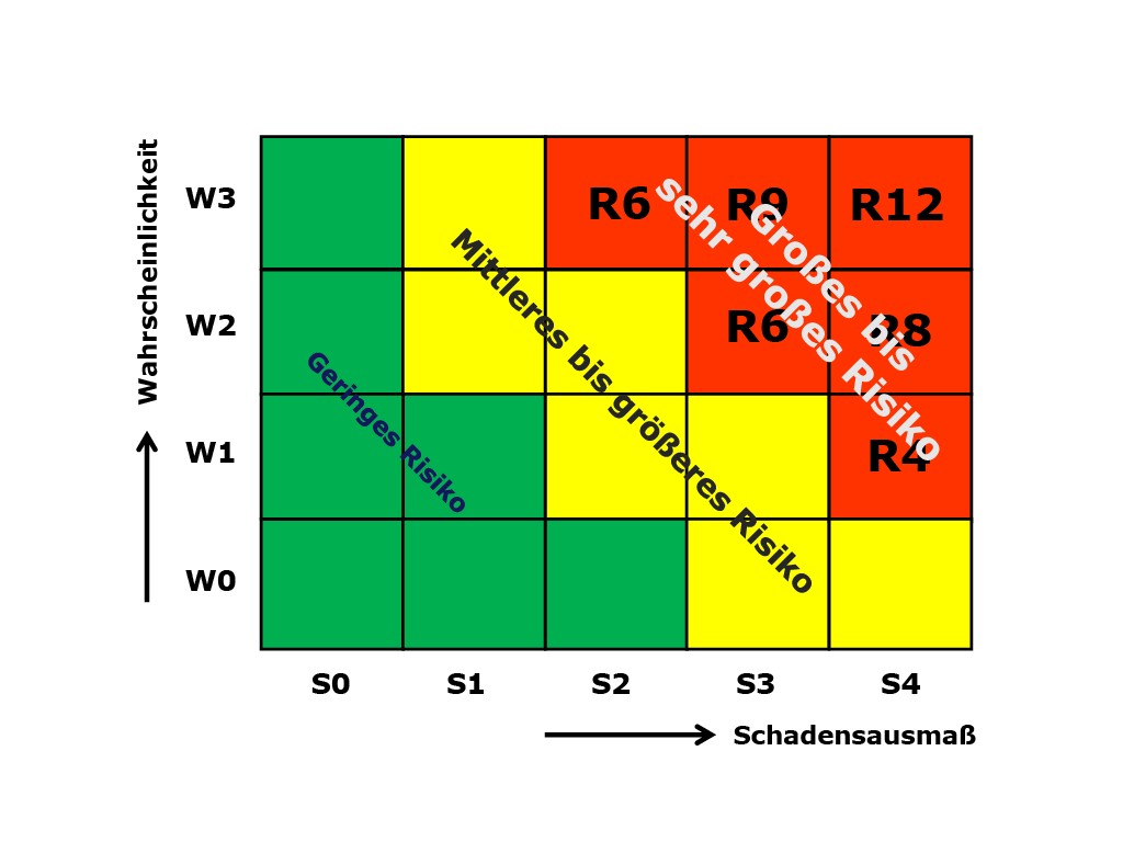 - R4 – R6: großes Risiko, das mittel- bis kurzfristig reduziert werden sollte,